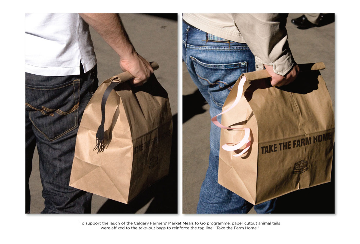 Calgary Farmer`s Market: возьми ферму с собойДля того чтобы усилить месадж: "Возьми ферму домой", который был разработан к открытию фермерского рынка в Калгари, агентство WAX, Calgary прикрепила к пакетам бумажные хвостики разных животных. В таких пакетах посетители рынка уносят продукты и еду (Meals to go) из ресторанов быстрого питания.Надпись: "Возьми ферму домой" Агентство: WAX, Calgary, Canada Креативный директор: Joe Hospodarec Арт директор: Scott Shymko Копирайтер: Nick Asik |