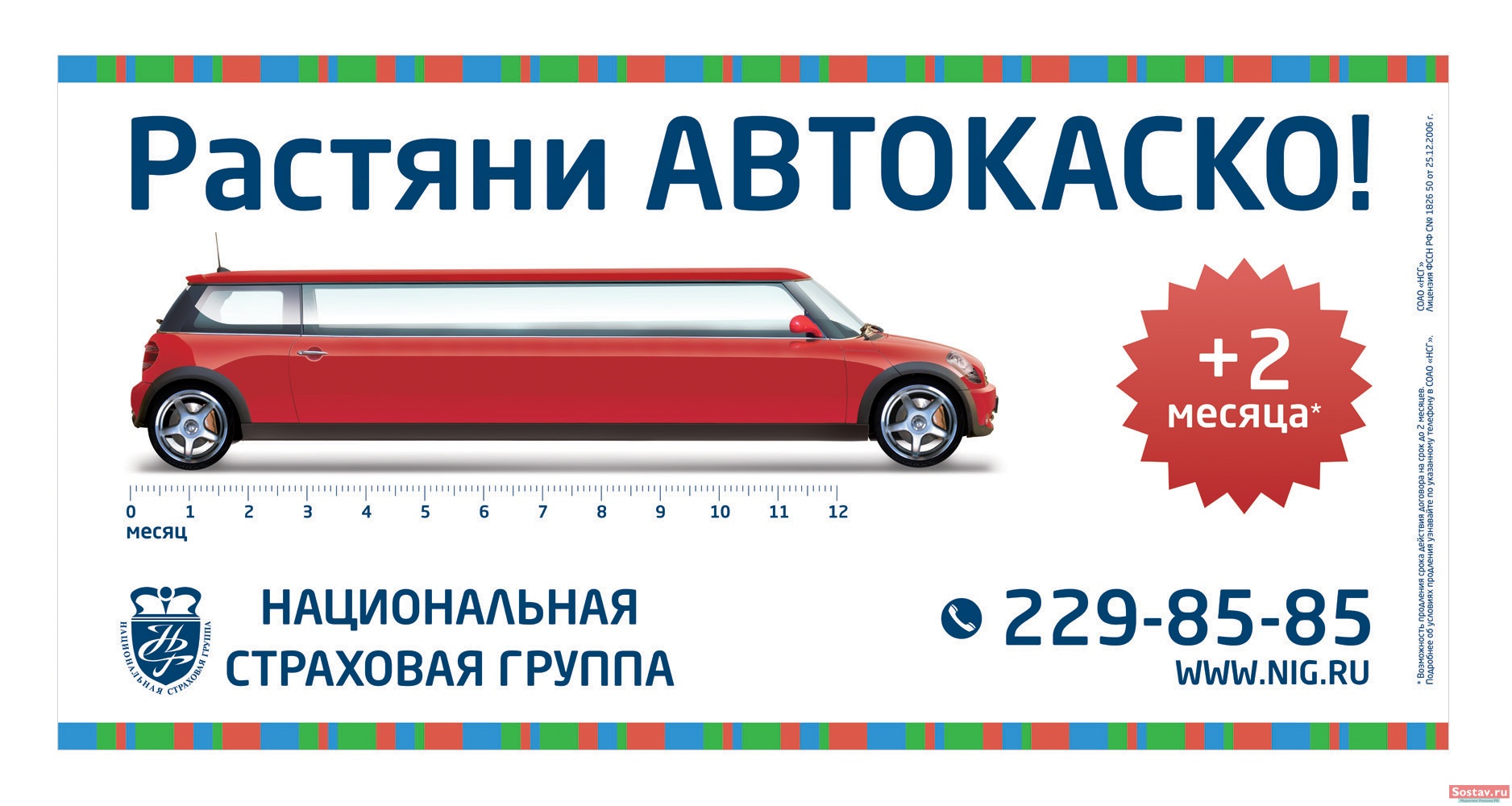 В Москве пройдет рекламная кампания "Национальной страховой группы" ("НСГ") - "Растяни АВТОКАСКО!"В основу весенней рекламной кампании легла программа страхования "60 дней", разработанная "Национальной страховой группой". Суть новой программы состоит в следующем: клиенты, приобретающие в "НСГ" полис КАСКО в течение 3 месяцев (апрель, май, июнь 2008 года), будут иметь возможность без доплат увеличить срок действия своего полиса на то количество дней, которое автомобиль не будет использоваться (например, страхователь собирается в отпуск на 7 дней, соответственно, по его заявлению действие полиса будет увеличено на 7 дней). Риск повреждения автомобиля в результате ДТП на момент его простоя исключается.В качестве основных рекламных носителей используются щиты наружной рекламы и радиостанции. С 1 по 30 апреля под рекламную кампанию "НСГ" в Москве будет занято 100 сторон билбордов 3х6 м на ведущих магистралях города. С 3 по 22 апреля в эфире трех радиостанций ("Авторадио", "Маяк", "City FM") в утренний и вечерний прайм-тайм будут появляться рекламные ролики "НСГ". Выбранные радиостанции обеспечивают охват основных сегментов слушателей-автомобилистов. "Авторадио" - популярная и массовая московская радиостанция, "Маяк" - интеллектуальное направление new's & talk, "City FM" - радиостанция, ориентирующаяся на бизнес-аудиторию. |