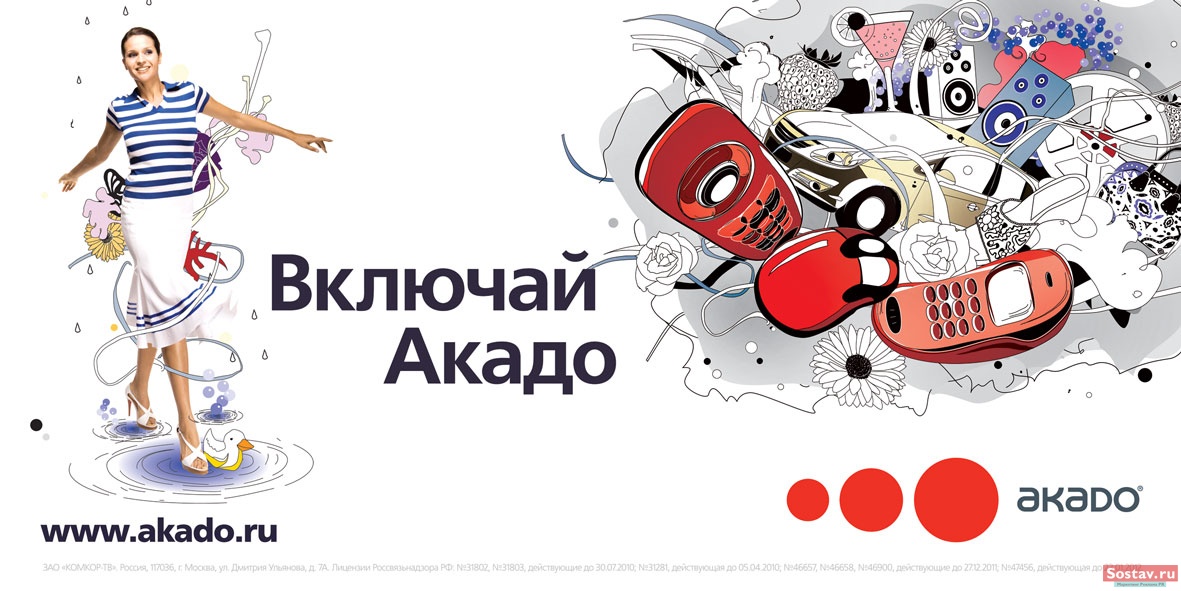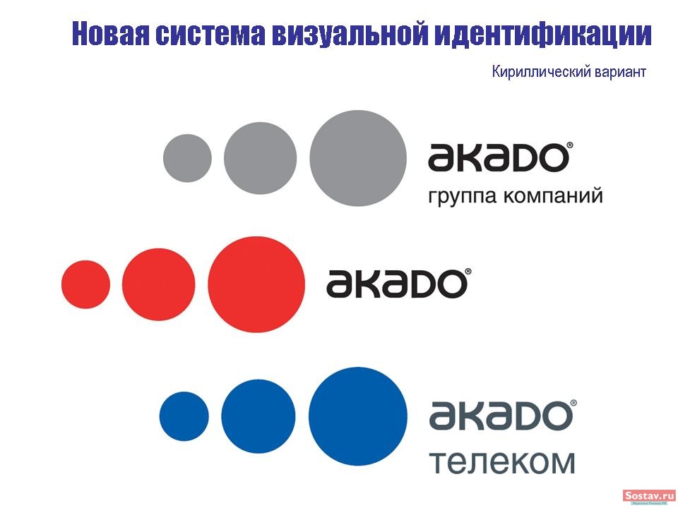 Рекламная стратегия учитывает интересы обеих операционных компаний: на «имиджевом» этапе сообщения в адрес b2c и b2b-аудитории будут брендированы соответственно «красным» или «синим» «Акадо». Красный «Акадо» известен с июня 2005 года и по-прежнему «работает» на потребительский сектор. Синий вариант логотипа впредь будет использоваться ОАО «Комкор», которое отныне действует под маркой «Акадо Телеком» (при сохранении прежнего наименования юридического лица) и ориентируется на корпоративных пользователей. Далее, на «продуктовом» этапе, сообщения в адрес различных целевых групп от имени «АКАДО» и «Акадо Телеком» будут разделены уже по каналам распространения.