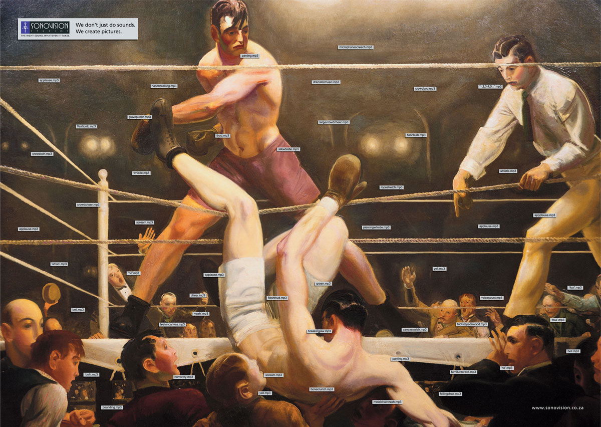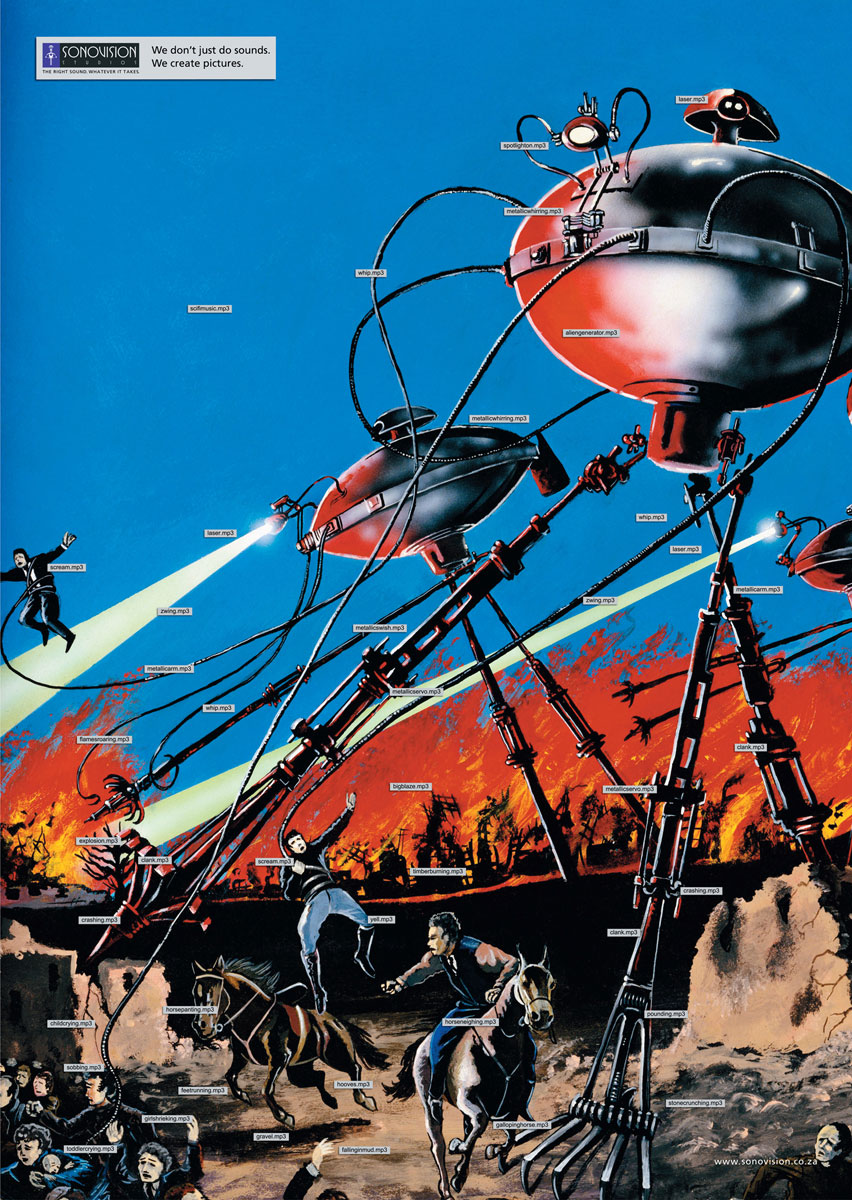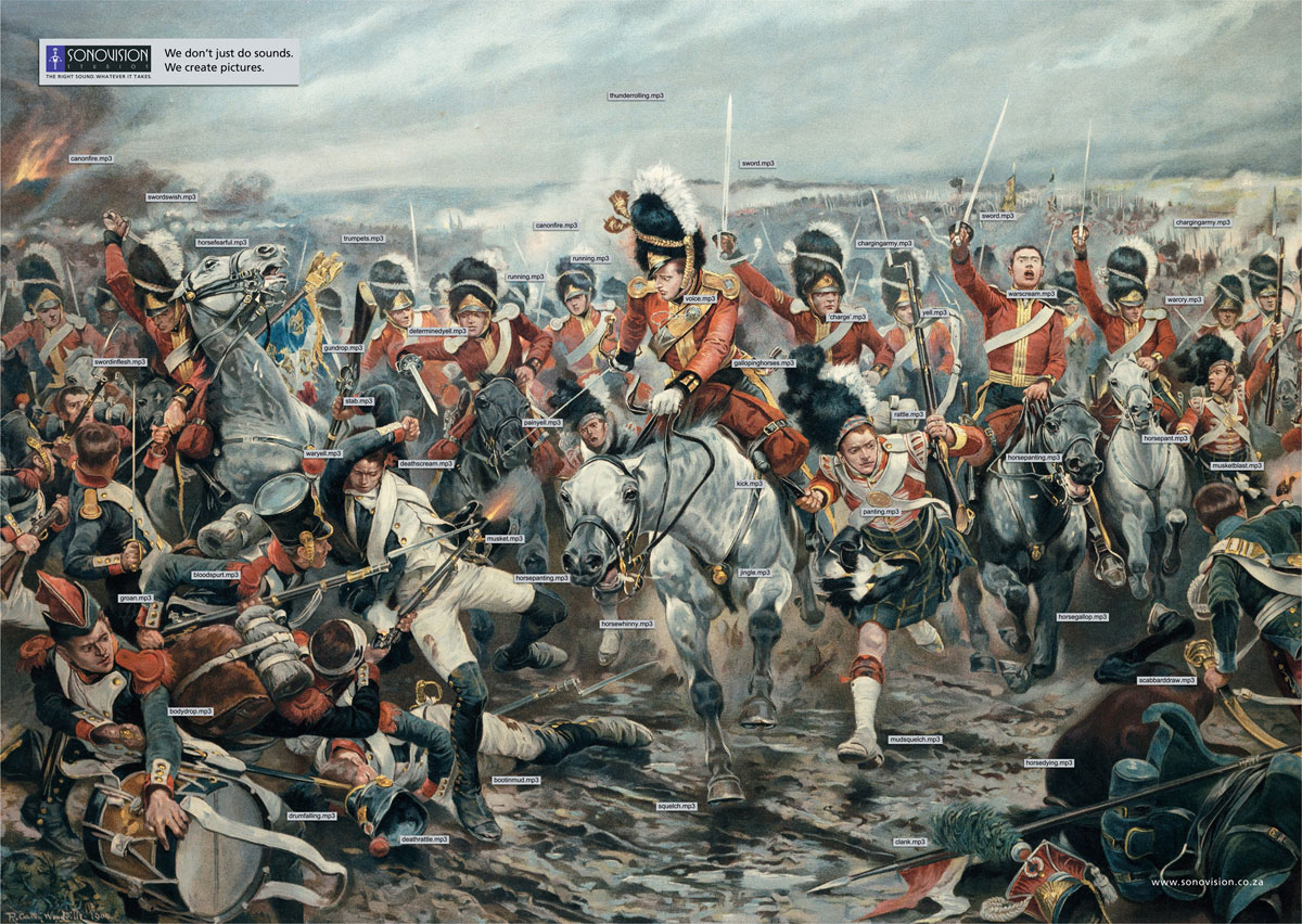 После работы студии звукозаписи Sonovision картины зазвучатСмотря на беззвучную картинку, сложно представить себе всю грандиозность происходящего, считает южноафриканское рекламное агентство DraftFCB. Чтобы исправить эту ситуацию, существует студия звукозаписи Sonovision, которая не просто делает звуки, а создает полную картину происходящего вокруг. Чтобы проиллюстрировать эту мысль, креаторы агентства "добавили" к изображениям звуки.Надпись: "Мы не просто делаем звуки. Мы создаем картины." Агентство: DraftFCB, ЮАР Творческий директор: Rob Mclennan, Adam Wittert Арт директор: Ivor Forrester Копирайтер: Adam Wittert |