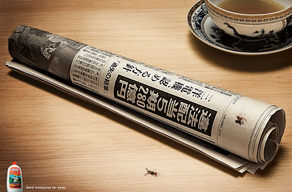 Off! отправляет комаров далеко и надолгоПеред вами рекламный плакат, изготовленный бразильским агентством Giovanni+Draftfcb Rio de Janeiro для репеллента Off! от SC Johnson. Репелленты - это средства, которые не убивают насекомых насмерть, а только отгоняют их запахом. И именно поэтому комары перебрались из солнечной Бразилии в далекую азиатскую страну, о чем можно судить по газете, которой только что прихлопнули комара.Надпись: "Отправь комаров подальше." Агентство: Giovanni+Draftfcb Rio de Janeiro Творческий директор: Adilson Xavier, Cristina Amorim, Fernando Barcellos Арт директор: Ricardo C?mara, Felipe Gomes Копирайтер: Leonardo Bartoli |