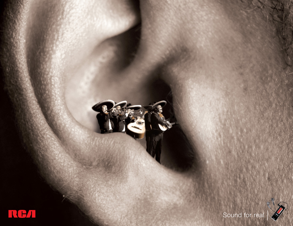 Музыка в твоих ушах в рекламе плееров RCARCA (Radio Corporation of America) - это торговая марка, под которой компания Thomson SA выпускает бытовую электронику - телевизоры, видеомагнитофоны, DVD-проигрыватели и, конечно же, MP3-плееры. Именно для рекламы последних агентством Publicidad Comercial LOWE & Partners и была создана эта кампания.Агентство: Publicidad Comercial LOWE & Partners, Сан-Педро-Сула, Гондура с Творческий директор / Копирайтер: Enrique Zaldivar Арт директор / Иллюстратор / Фотограф:Carlos Cort?s |