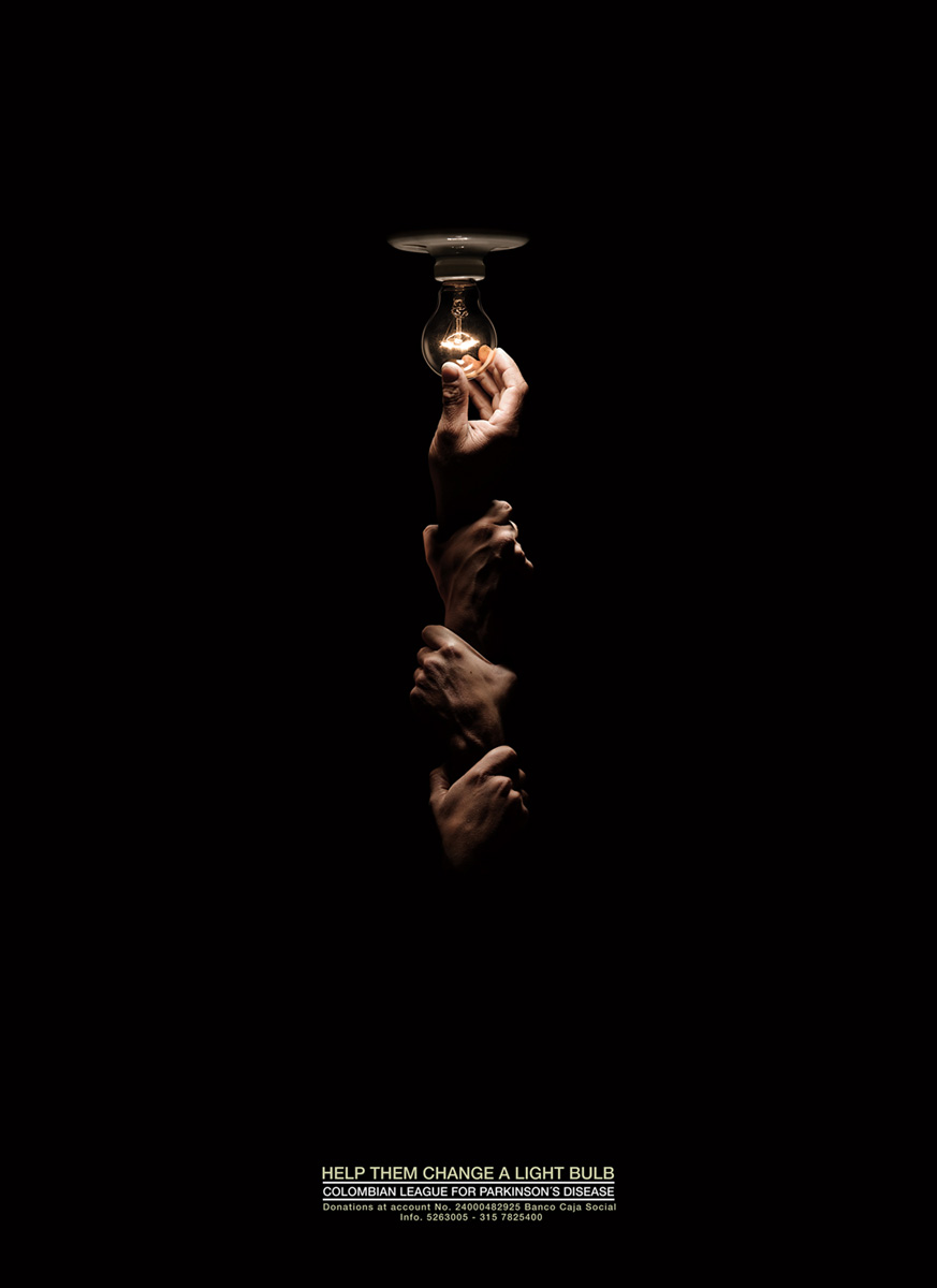 Leo Burnett Colombia призывает протянуть руку помощи людям, страдающим болезнью ПаркинсонаЛюдям, страдающим болезнью Паркинсона, жить обычной жизнью мешает постоянная дрожь во всем теле, поэтому им сложно совершать действия, которые здоровым людям кажутся элементарными. Рекламное агентство Leo Burnett Colombia, разработавшее эту социальную кампанию для колумбийской ассоциации Colombian League for Parkinson's Disease, призывает нас оказать помощь тем, кто страдает болезнью Паркинсона.Надпись: "Помоги им перевернуть страницу. Помоги им открыть дверь. Помоги им поменять лампочку." Агентство: Leo Burnett Colombia Творческий директор: Otavio Schiavon, Carlos Murad Арт директор: Andres Marante Копирайтер: Alexis Ospina Фотограф: Fernando Forero |