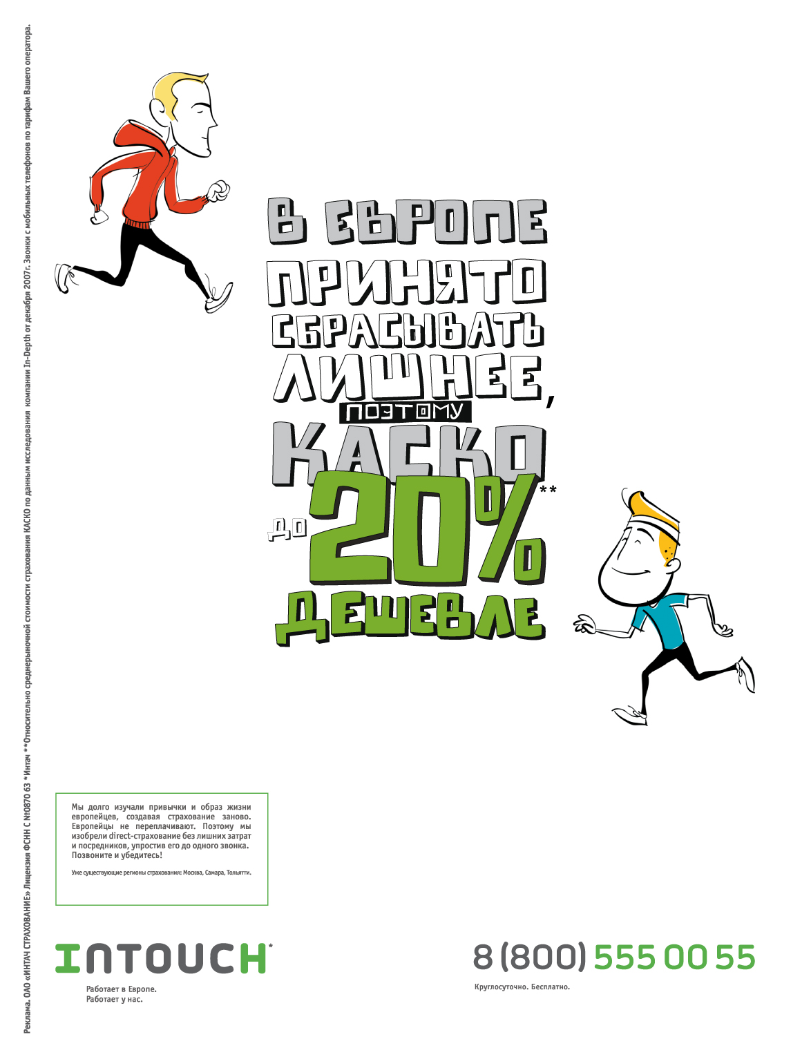 "Интач страхование" научит россиян европейским ценностямКомпания "Интач страхование", которая недавно вышла на российский рынок и заявила о себе как о первом операторе прямого страхования, развернула обширную рекламную кампанию по продвижению своего бренда в регионах запуска - Москве и Самаре.В основу креативной концепции легло утверждение, которое можно кратко изложить словами "Что хорошо европейцу, то и русскому подойдет". Поскольку Intouch имеет обширный опыт работы с Европейскими потребителями, она имела возможность следить за их образом жизни. Европейцы привыкли к удобству и хорошему сервису, требовательны и умеют разумно тратить деньги. Именно эти привычки и качества "Интач страхование" надеется привить русскому потребителю страховых услуг. Разработкой креативной концепции и роликов занималось агентство "Инстинкт". 8 апреля по центральному ТВ запущены ролики "Изобретения" и "Полис ОСАГО за один день", о которых Sostav.ru сообщал ранее. Помимо рекламы на ТВ, коммуникация включает в себя такие каналы, как наружная реклама, реклама в транспорте и Интернете. Разработкой и реализацией медийной стратегии для компании "Интач страхование" занимается агентство Медиа-План. Агентство Медиа-План, основанное в 2001 году, входит в группу компаний Optimum Media OMD Group, занимающую лидирующие позиции на российском медийном рынке. Брендинг осуществило агентство BBDO Branding. Программу по связям с общественностью компании "Интач страхование" реализует агентство Pleon. Как сообщили Sostav.ru в пресс-службе компании "Интач страхование", в ходе проекта был проведен комплекс исследований, разработана стратегия и визуальная идентичность бренда. Для нового игрока было разработано уникальное позиционирование, которое должно обеспечить дифференциацию от конкурентов не только в момент запуска, но и в долгосрочной перспективе. Выполненный в современной графической стилистике, лаконичный, дружелюбный дизайн логотипа и фирменного стиля призван подчеркнуть европейское происхождение. Состав творческой группы: Имиджевый ролик "Изобретения" и "ОСАГО": Директор по маркетингу: Инна Романьоли Руководитель направлений маркетинговых коммуникаций: Анна Нижник Менеджер по рекламе: Татьяна Артемова Креативное агентство Instinct: Креативные директора: Роман Фирайнер, Ярослав Орлов Арт-директор: Алексей Демин Копирайтер: Юлия Аничкина Продюсер: Сюзанна Аль-Самарраи Менеджер по стратегическому планированию: Ольга Харина Команда по работе с клиентами: Анна Итина, Ирина Горнова. |
