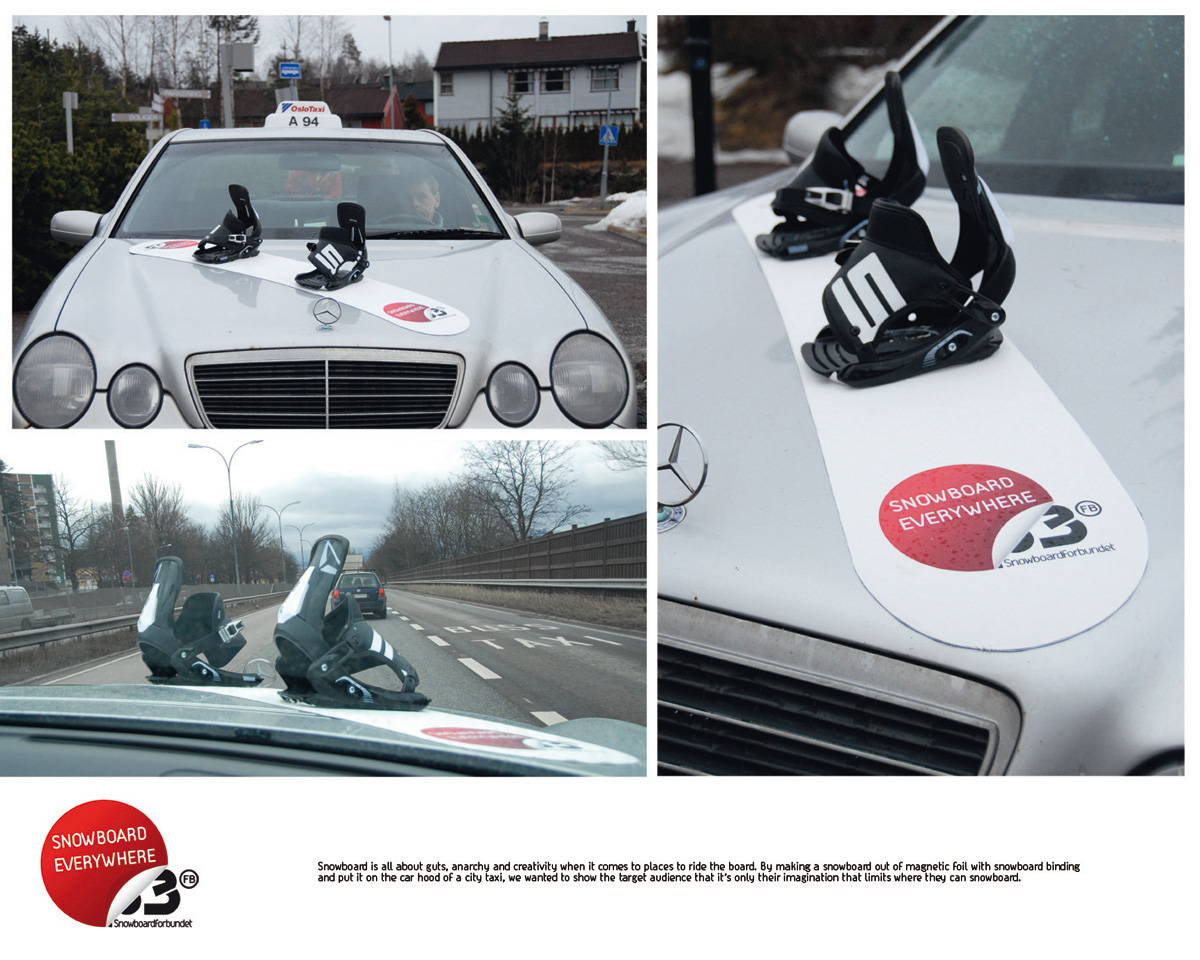Сноубординг на капоте машины - новая реальность UncleСноубординг - это не просто вид спорта, это внутренне состояние, это анархия, это творчество, считают в Норвежской Ассоциации Сноубординга (Norwegian Snowboard Association), и только от райдера зависит, где, когда и как он будет кататься.В норвежском рекламном агентстве Uncle из магнитного листа создали сноуборд с креплениями и поместили его на капот такси. Агентство: Uncle, Норвегия |