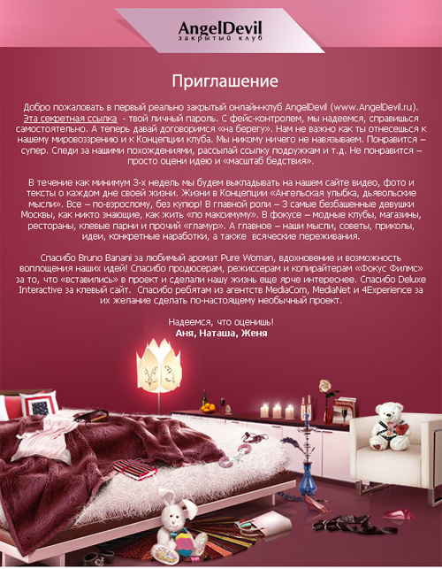 «У моих подруг давно созрела настоящая концепция жизни молодой продвинутой актуальной женщины (их девиз – ангельская улыбка, дьявольские мысли), но они все не знали, куда с ней сунуться», - пишет одна из трех «авторов сайта» в своем блоге. В итоге им пришла в голову открыть некий Закрытый клуб, где бы они в формате блогов рассказывали о своей жизни «без купюр», пропагандируя свою жизненную концепцию. А эта концепция по счастливому совпадению обстоятельств, оказалась близка бренду Bruno Banani.