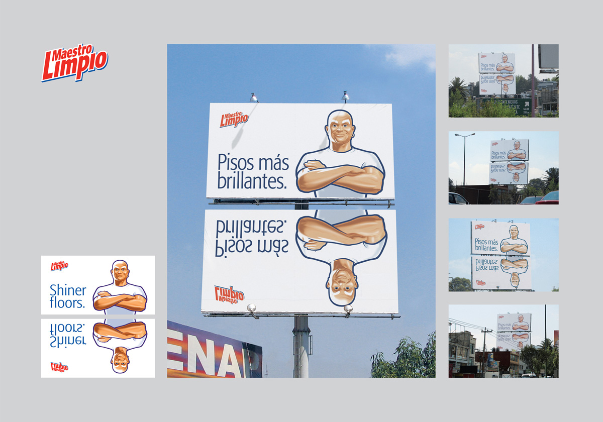 Maestro Limpio: ваши полы сияют до такой степени, что в них можно смотреться как зеркалоДля визуального подтверждения слогана агентство Grey решило по-новому использовать рекламные билборды. На нижнем билборде изображено зеркальное отражение персонажа Maestro Limpio. При просмотре складывается впечатление, что это отражение в начищенном до зеркального блеска полу.Слоган: "Сияющие полы" Агентство: Grey, Buenos Aires, Argentina Исполнительные креативные директора: Pablo Gil, Sebastian Gar?n Креативные директора: Diego Rubio, Coco Olivera Арт директор: Diego Rubio Копирайтер: Coco Olivera |