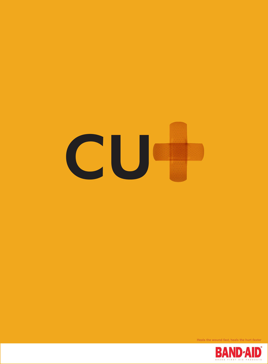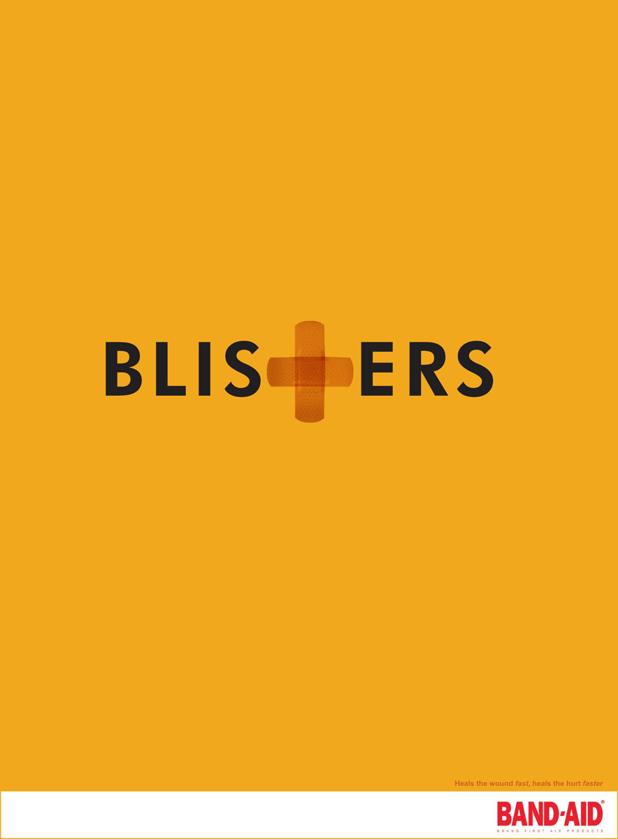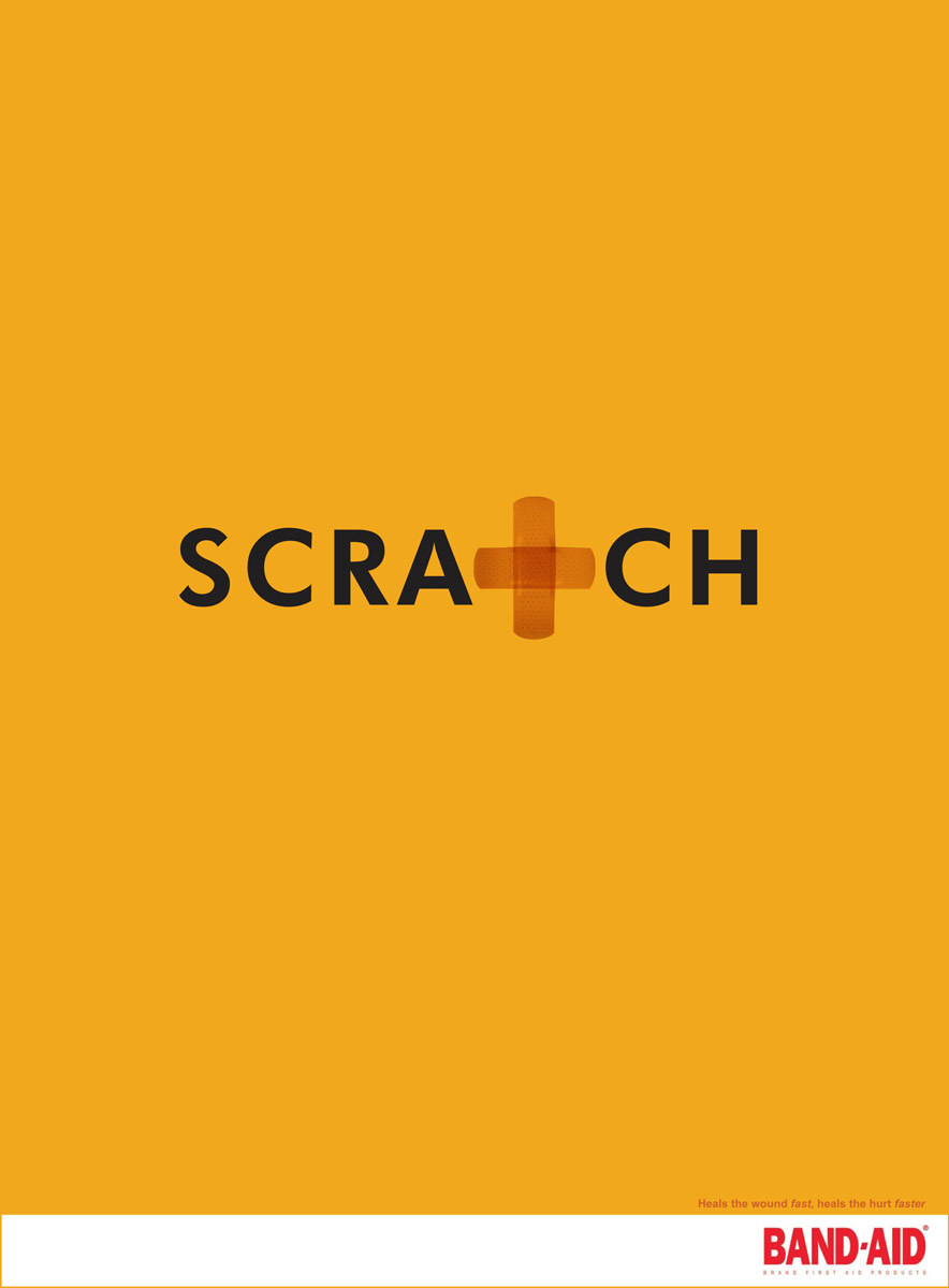 Необычное применение пластыря Band-AidКак утверждает рекламное агентство JWT, пластырь Band-Aid не только быстро вылечит ваши порезы и царапины, но и очень быстро избавит вас от болевых ощущений. Достаточно заклеить рану пластырем, и она вместе с болью перестает существовать.Для более полного донесения послания до ЦА, JWT поменяла ключевые буквы в словах, которые представлены на плакатах, на пластырь. Надпись гласит: "Лечит раны быстро, лечит боль быстрее" Сосав творческой группы: Агентство: JWT, New Delhi, India Копирайтер: Rakesh Ranjan |