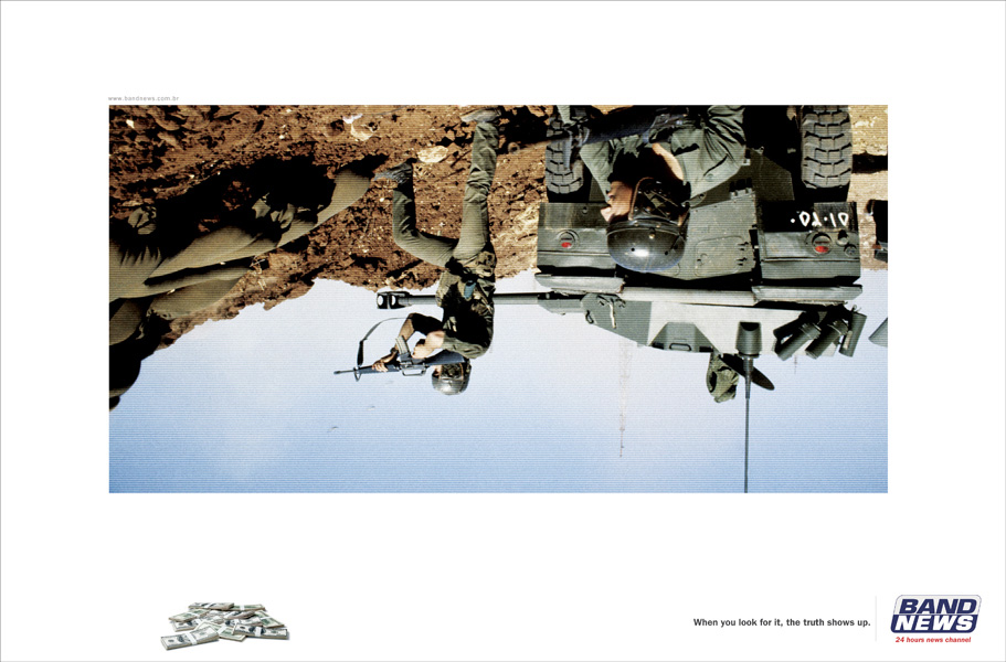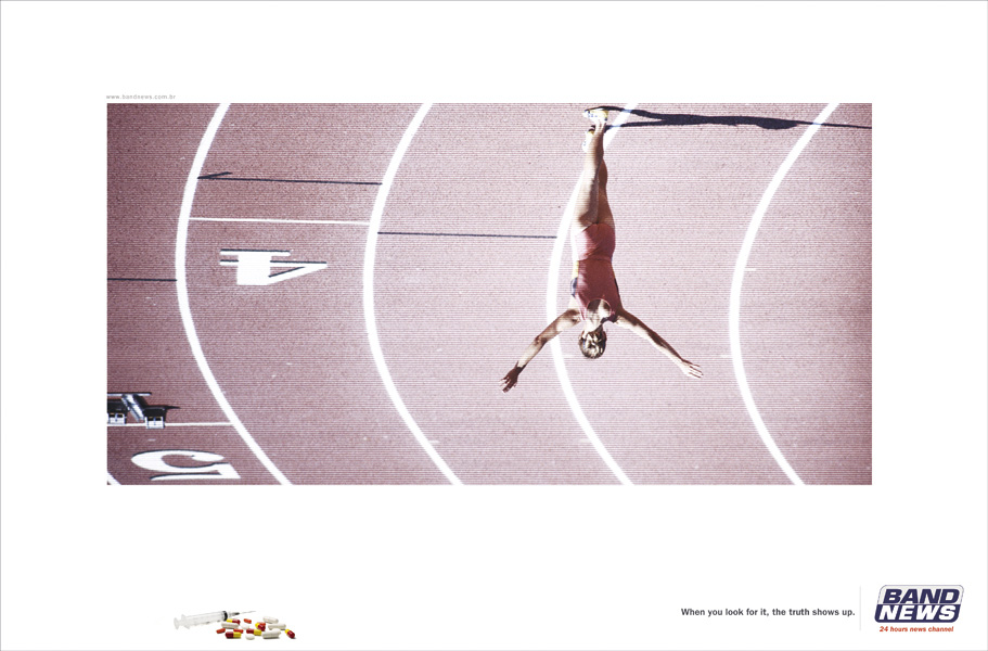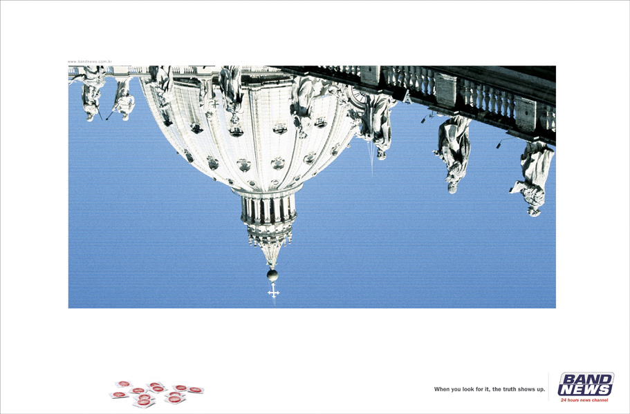 BandNews переворачивает мир вверх тормашками, чтобы показать нам правдуКак рассказывает нам бразильское рекламное агентство Artplan Rio de Janeiro, 24-часовой новостной канал BandNews преподносит нам совершенно неприкрытые цензурой новости. Чтобы узнать правду, журналистам этого канала приходится работать в поте лица, переворачивая все с ног на голову. В результате мы узнаем, что за внешней добропорядочностью церковников скрывается похоть, за мировыми рекордами - наркотики, а за жуткими войнами - огромные деньги.Надпись: "Когда вы ищете этого, правда выходит на поверхность." Агентство: Artplan Rio de Janeiro, Бразилия Творческий директор: Roberto Vilhena Арт директор: Sergio Carvalho Копирайтер: Daniell Rezende, Danilo Maia |