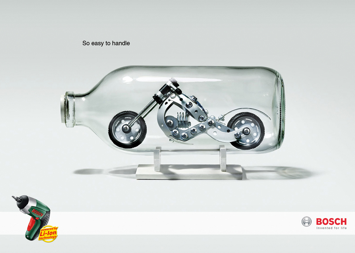 Bosch - удобно и простоВсе гениальное просто, продукция фирмы Bosch не только очень функциональная, но и удобная. Как утверждает агентство Grey автоматической отверткой, которая представлена на плакатах, даже можно собрать мотоцикл в бутылке.Агентство: Grey Bucharest, Romania Креативные директора: Claudiu Dobrita, Stefan Vasilachi Арт директор: Razvan Ludu Копирайтер: Oana Gheorghe Фотограф: Tudor Cuciuc |
