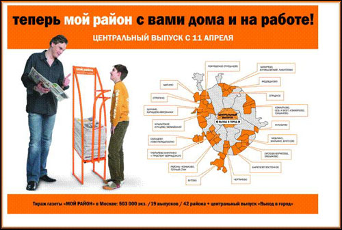 "Мoй район" появится в ресторанах, кафе и магазинах центра МосквыС 11 апреля 2008 г. газета "Мой Район" выходит и в центре столицы. Центральный выпуск получил название "Выход в город", его стартовый тираж составил 20 000 экземпляров, но постепенно будет увеличиваться. Распространение центрального выпуска ограничено пределами ТТК (Третьего Транспортного Кольца)Центральный выпуск рассчитан на людей, не проживающих, а работающих в центре, поэтому основными точками распространения станут кафе, рестораны, супермаркеты. Среди партнеров по распространению газеты в Центре: "Елки-палки", "Шоколадница", "Якитория", "Гин-но таки", "Московский Дом книги", "Седьмой континент" и "Рамстор", крупные торговые центры.