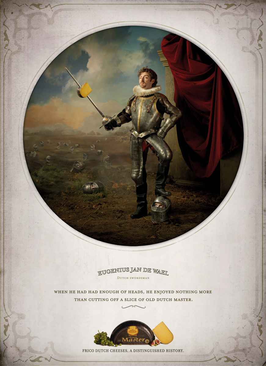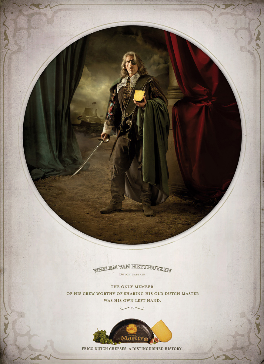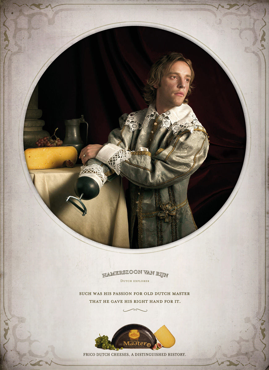 Frico Old Dutch Master - сыр с выдающейся историейКак рассказывает нам французское рекламное агентство CLM BBDO, создавшее эту кампанию, голландский сыр Frico Old Dutch Master славится своей выдающейся историей, ведь он составлял компанию и радовал знаменитых голландских военачальников, рыцарей и исследователей.Надпись: "Единственный член его команды, достойный того, чтобы разделить с ним Old Dutch Master, - это его левая рука. Когда он отрубил достаточно голов, он наслаждался не чем иным, как отрезанием кусочка Old Dutch Master. Его страсть к Old Dutch Master была столь сильной, что он отдал свою правую руку за него." Агентство: CLM BBDO, Париж, Франция Творческий директор: Gilles Fichteberg, Jean-Francois Sacco Арт директор / Копирайтер: C?line Artigau, Nicolas Hurez Фотограф: Vincent Dixon |