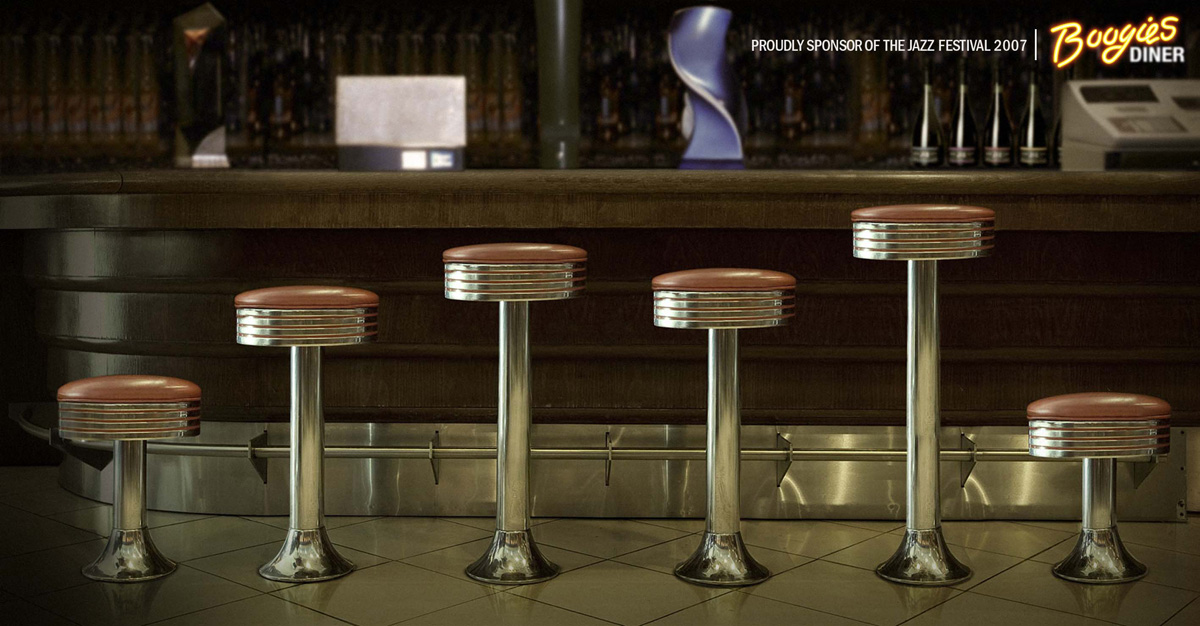 Джазовые стулья в ресторане Boogies DinerРесторан Boogies Diner с гордостью рассказывает нам о том, что он стал почетным спонсором Фестиваля Джаза 2007. Для этой цели азиатский филиал агентства Impact BBDO представил барные стулья в Boogies Diner в виде кнопок истинно джазового музыкального инструмента саксофона.Надпись: "Почетный спонсор Фестиваля Джаза 2007." Агентство: Impact BBDO, Jeddah, Саудовская Аравия Творческий директор / Арт директор / Копирайтер: Ahmad Beck Фотограф: Steve Kozman Ретушь: Amin Daw |
