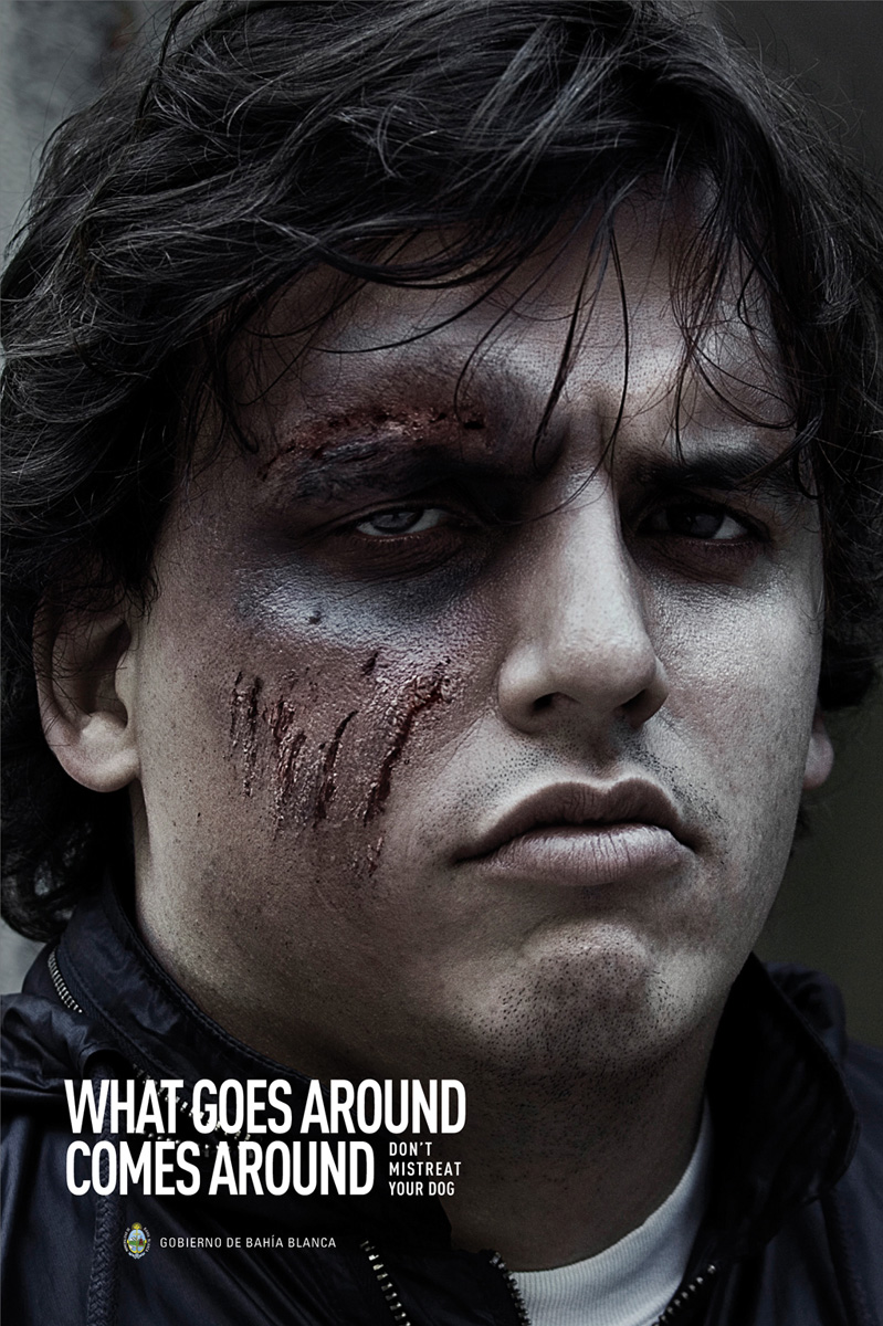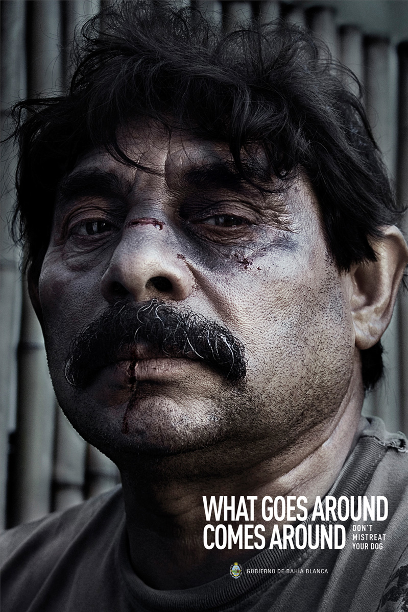 Собака бывает кусачей только от жизни собачей…Управление аргентинского города Баия-Бланка совместно с рекламным агентством Savaglio\TBWA предостерегают владельцев собак от укусов своих питомцев. Если вы не хотите быть покусанным своей собакой и стать похожим на героев этих принтов, то не бейте животное, ведь, как известно, как аукнется, так и откликнется…Надпись: "Как аукнется, так и откликнется. Не обращайтесь плохо с вашей собакой." Агентство: Savaglio\TBWA, Буэнос-Айрес, Аргентина |