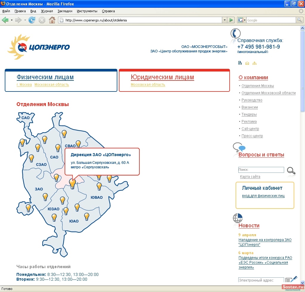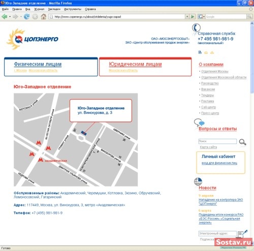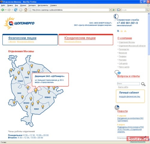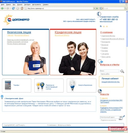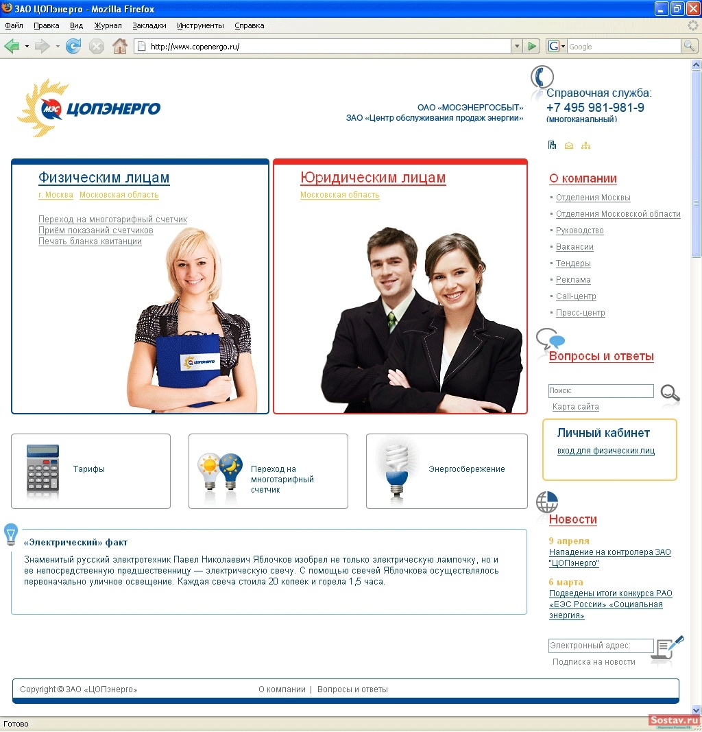 Сайт ЦОПэнерго - с человеческим лицомСделать сайт с человеческим лицом для 5 миллионов бытовых потребителей и более 45 тысяч юридических лиц - такую задачу ЗАО "ЦОПэнерго" поставила перед студией "Первый миллион".На сайте "Центра обслуживания продаж энергии" вы сможете заполнить и распечатать квитанцию, написать заявление о переходе на двухтарифную систему учета, уточнить адрес отделения компании и прочее. Адрес сайта: www.copenergo.ru |