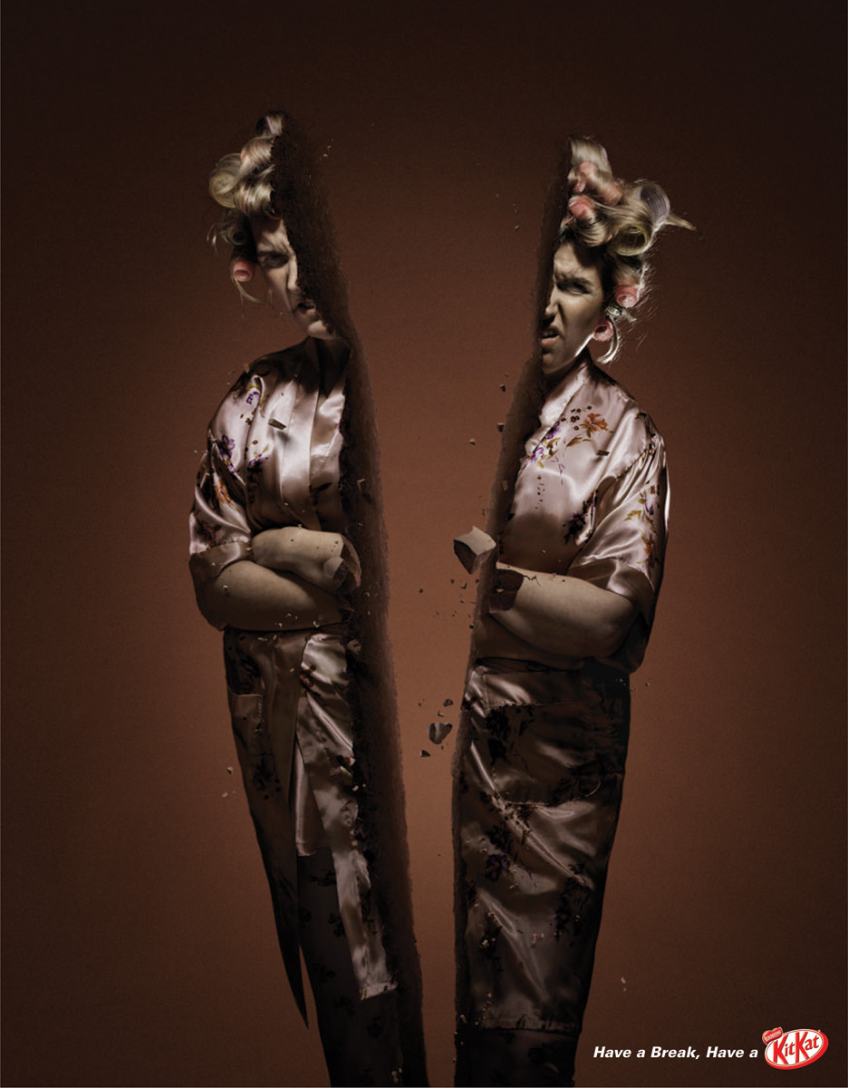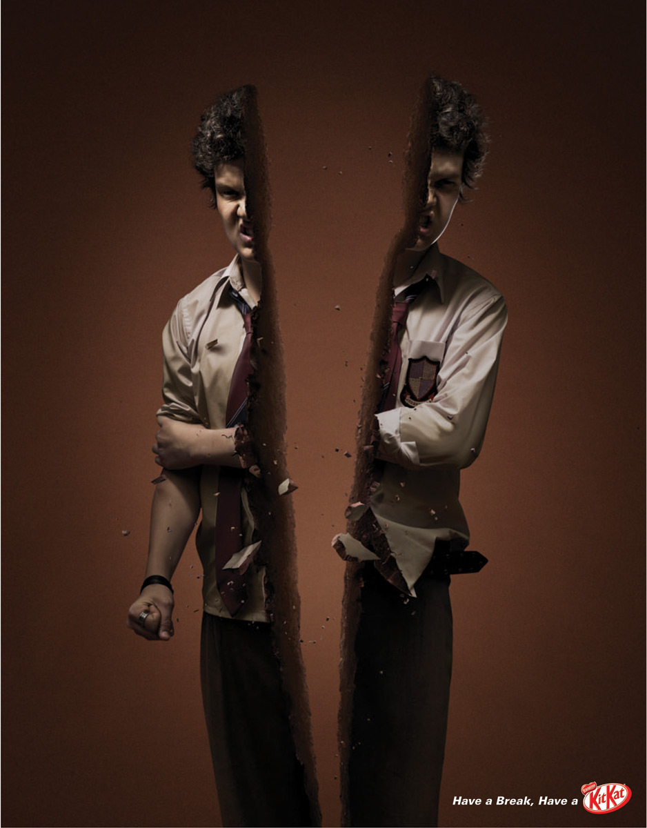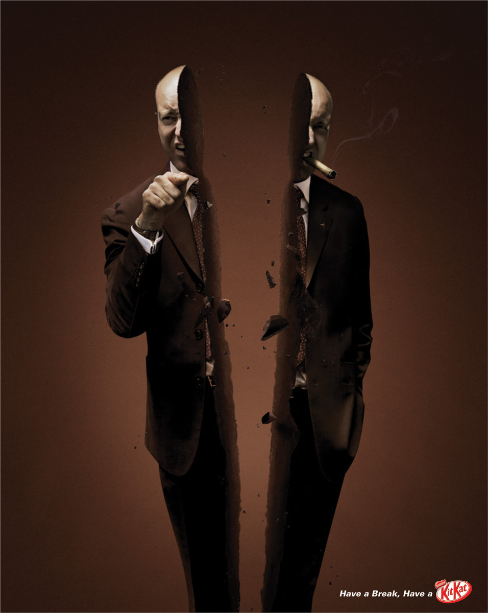 Есть перерыв - есть KitKatЗамучили жизненные неурядицы? Шеф на работе грозит увольнением? Жена дома пилит не переставая? Самое время абстрагироваться от негатива и сделать перерыв, чтобы насладиться замечательным вкусом KitKat.Композиция рекламных плакатов обусловлена двояким значением слова "Break", которое одновременно означает как и "разламывание", так и "перерыв". Слоган: "Есть перерыв - есть KitKat" Агентство: JWT, Hong Kong Креативные директора: Neil Leslie, Gerard Or Арт директора: Thomas Chung, Frankin Chan Копирайтер: Robert Chen Фотограф: Franklin Lau Ретушь: In-Between |