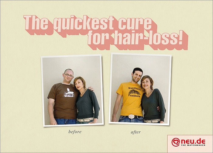 Сайт знакомств Neu.de избавит вас от подружки-плоскодонки и приятеля с пивным пузомЕсли у вашего друга выпадают волосы, если он не избавляется от своего пивного брюшка или если у вашей подруги недостаточно большая грудь, немецкое рекламное подразделение Saatchi & Saatchi предлагает быстрый способ исправить недостатки вашего партнера. Просто зайдите на сайт знакомств neu.de и найдите того, кто вас устраивает. Теглайн: "Самый быстрый курс лечения выпадения волос. Убери живот за 5 дней. Увеличение груди безоперации." Агентство: Saatchi & Saatchi, Франкфурт, Германия |