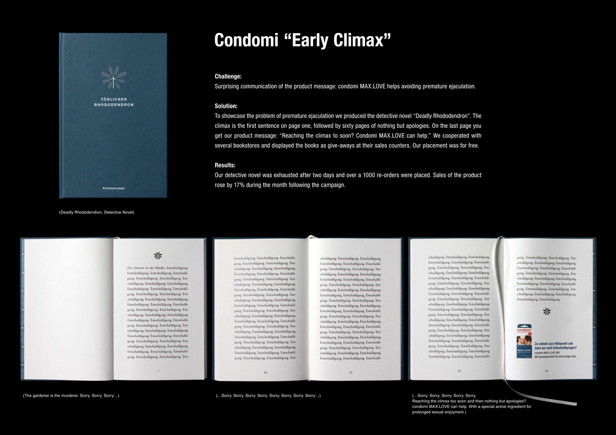 Condomi MAX.LOVE - пусть преждевременная эякуляция вас больше не тревожитПри создании рекламной кампании для немецкого производителя презервативов Condomi перед агентством cayenne стояла задача донести до ЦА месадж - Condomi MAX.LOVE помогают избежать преждевременной эякуляции.Для того, чтобы показать проблему и переживания, связанные с преждевременной эякуляцией, агентством cayenne была выпущена книга под названием "Deadly Rhododendron", которая начиналась с одного единственного слова - "оргазм". Остальные шестьдесят страниц детективной истории были наполнены ничем, иным как извинениями, что отлично иллюстрирует всю глубину переживаний и моральных мук, которые испытывает мужчина, попавший в такую весьма пикантную ситуацию. Последнюю страницу книги украшал вопрос: "Страдаете преждевременной эякуляцией? Condomi MAX.LOVE могут вам помочь". Книга распространялась совершенно бесплатно в рамках рекламной кампании в книжных магазинах на территории Германии. Агентство: cayenne, Germany Креативные директора: Marco Obermann, Andreas Ruthemann Art Directors: Andreas Ruthemann, Roman Lukowski Copywriters: Marco Obermann, S?nke Brehm Released: December 2008 |