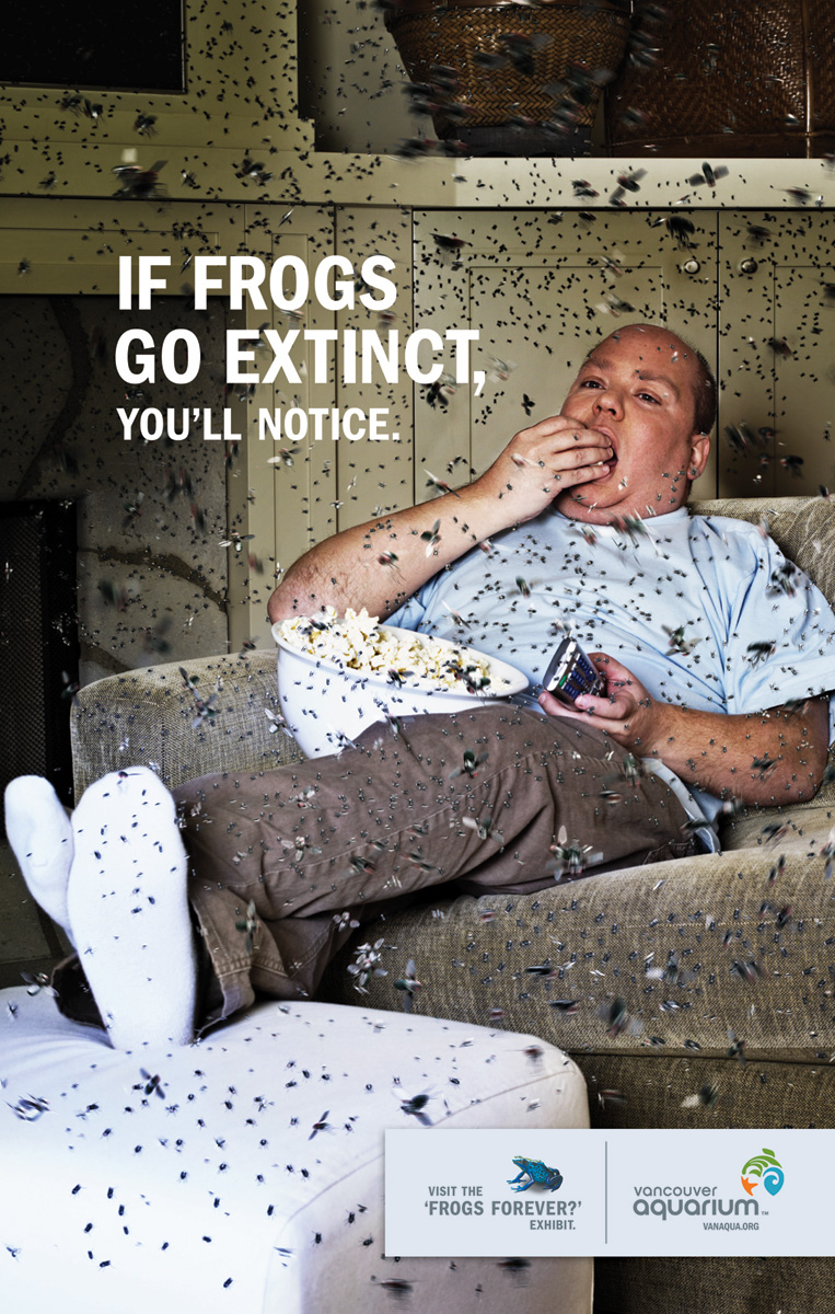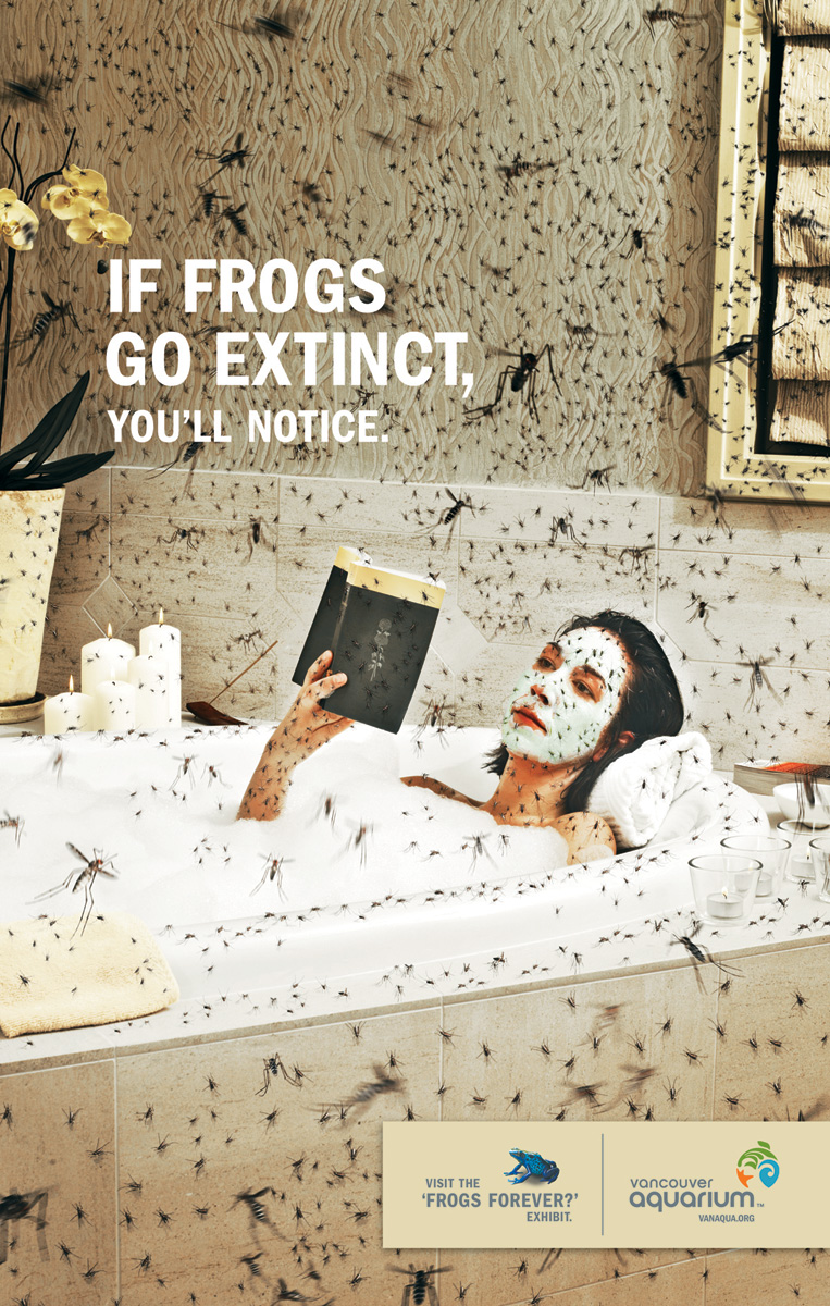 Принт-катастрофа или 28 дней без лягушек. Канадское рекламное агентство TAXI, Vancouver показало, как неудобно будет людям без лягушекКанадское рекламное агентство TAXI, Vancouver, разработало принты, рекламирующие выставку лягушек. Согласно мнению креативщиков этого РА, жизнь без лягушек станет намного менее комфортной - от насекомых будет просто не скрыться. Насколько драматично будут развиваться события без братьев наших квакающих - судить сложно, однако, если следовать меседжу этой кампании, средством от тараканов и мелких насекомых человечество уже не отделается. Теглайн кампании гласит: "If frogs go extinct, you'll notice" (если лягушки исчезнут - вы почувствуете это).Совсем недавно похожими имиджами нас радовало индийское рекламное агентство Euro RSCG Mumbai, продвигающее мыло Just. Advertising Agency: TAXI, Vancouver, Canada Creative Director: Michael Mayes Art Director: Raul Garcia Copywriter: Matt Bielby Photographer: Patrick Norman Digital Imaging: Render Unit Published: March 2008 |