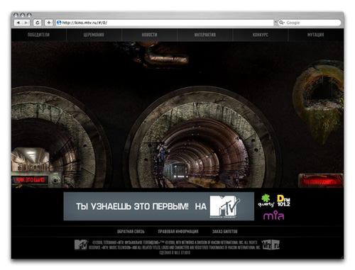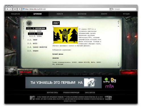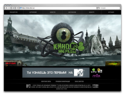 Nile Studio заканчивает работу над проектом "Кинонаграды MTV Россия 2008"Последней работой для проекта церемонии "Кинонаграды MTV 2008" стал промо-сайт, сделанный также как и фирменный стиль, в Nile Studio. Это уже третий большой проект сделанный компанией для культового молодежного телеканала.Напомним, что премия "Кинонаграды MTV Россия" была учреждена в 2006 году и успела стать одной из наиболее влиятельных национальных премий в области кино. Традиционно почетными гостьями и ведущими церемонии становятся заморские красавицы. В прошлом году лицом - и не только лицом! - кинонаград-2007 стала Памела Андерсон. На этот раз место приглашенной звезды заняла Пэрис Хилтон. Логотип, и, по совместительству, главный герой Кинонаград - гигантский черный глаз, парящий над опустевшей Москвой. Попадая на главную страницу сайта, посетитель оказывается посреди интерактивной трехмерной панорамы Красной Площади. Зеленоватые пульсирующие буквы в логотипе становятся единственным ярким пятном посреди беспросветного московского тумана. Форма и содержание на сайте четко разделены. Чтобы ознакомиться с разделами сайта, придется спуститься глубоко под землю, в таинственный секретный бункер. Там находится экран, на который проецируется вся информация. Атмосфера сайта и стилистика интерфейса наверняка напомнят геймерам классический "Fallout". Специально для сайта Кинонанград-2008 в Nile Studio на основе архивных хроник был смонтирован ролик, который можно посмотреть в разделе "О мутации". Трехминутная стилизация под научно-популярный фильм познакомит посетителя с вымышленной предысторией "Кинонаград 2008". По версии Nile Studio, советские ученые еще 30 лет назад предсказали, что в 2008 году человечество ожидает мутация, в результате которой тела людей трансформируются и приобретут форму глаза. В подземном бункере трудится группа ученых, которые пытаются победить мутацию. Несмотря на все их усилия, мутация разрастается, и в 2008 году ее эпицентром становится Красная площадь, над которой материализуется зловещий черный глаз. И только своим участием в голосовании посетители смогут повернуть биологическую трансформацию вспять. Самой таинственной частью сайта стал многометровый слой земли между поверхностью и бункером, который посетитель видит, когда перемещается между Красной площадью и подземельем. За считанные секунды перед глазами проносятся показанные в разрезе линии московского метрополитена, знаменитые секретные ветки Метро-2, погребенные в толще земли скелеты вымерших животных, сундуки, полные сокровищ, и многое другое. Работа над сайтом, начатая в феврале, продолжается и сейчас, когда голосование уже закончилось и сама церемония позади. В разделе "Как все это было" можно посмотреть отчеты о событии и узнать, кто победил в номинациях, а самые преданные поклонники церемонии могут поставить себе специальный скринсейвер и десктопы из раздела "Скачать".