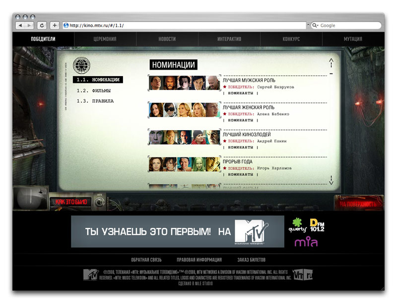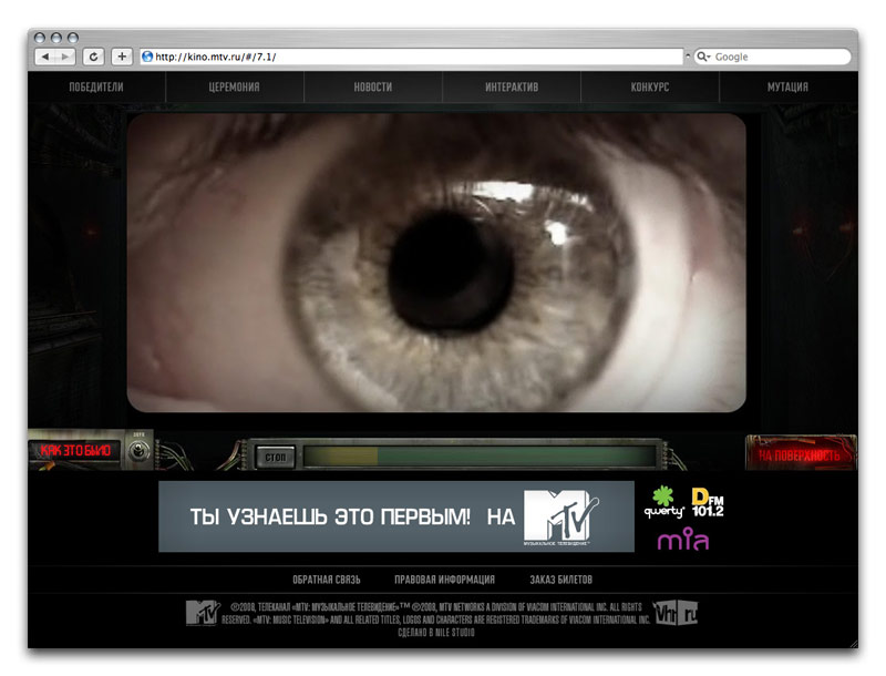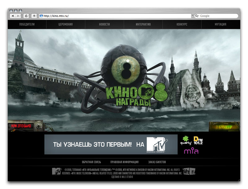 Nile Studio заканчивает работу над проектом "Кинонаграды MTV Россия 2008"Последней работой для проекта церемонии "Кинонаграды MTV 2008" стал промо-сайт, сделанный также как и фирменный стиль, в Nile Studio. Это уже третий большой проект сделанный компанией для культового молодежного телеканала.Напомним, что премия "Кинонаграды MTV Россия" была учреждена в 2006 году и успела стать одной из наиболее влиятельных национальных премий в области кино. Традиционно почетными гостьями и ведущими церемонии становятся заморские красавицы. В прошлом году лицом - и не только лицом! - кинонаград-2007 стала Памела Андерсон. На этот раз место приглашенной звезды заняла Пэрис Хилтон. Логотип, и, по совместительству, главный герой Кинонаград - гигантский черный глаз, парящий над опустевшей Москвой. Попадая на главную страницу сайта, посетитель оказывается посреди интерактивной трехмерной панорамы Красной Площади. Зеленоватые пульсирующие буквы в логотипе становятся единственным ярким пятном посреди беспросветного московского тумана. Форма и содержание на сайте четко разделены. Чтобы ознакомиться с разделами сайта, придется спуститься глубоко под землю, в таинственный секретный бункер. Там находится экран, на который проецируется вся информация. Атмосфера сайта и стилистика интерфейса наверняка напомнят геймерам классический "Fallout". Специально для сайта Кинонанград-2008 в Nile Studio на основе архивных хроник был смонтирован ролик, который можно посмотреть в разделе "О мутации". Трехминутная стилизация под научно-популярный фильм познакомит посетителя с вымышленной предысторией "Кинонаград 2008". По версии Nile Studio, советские ученые еще 30 лет назад предсказали, что в 2008 году человечество ожидает мутация, в результате которой тела людей трансформируются и приобретут форму глаза. В подземном бункере трудится группа ученых, которые пытаются победить мутацию. Несмотря на все их усилия, мутация разрастается, и в 2008 году ее эпицентром становится Красная площадь, над которой материализуется зловещий черный глаз. И только своим участием в голосовании посетители смогут повернуть биологическую трансформацию вспять. Самой таинственной частью сайта стал многометровый слой земли между поверхностью и бункером, который посетитель видит, когда перемещается между Красной площадью и подземельем. За считанные секунды перед глазами проносятся показанные в разрезе линии московского метрополитена, знаменитые секретные ветки Метро-2, погребенные в толще земли скелеты вымерших животных, сундуки, полные сокровищ, и многое другое. Работа над сайтом, начатая в феврале, продолжается и сейчас, когда голосование уже закончилось и сама церемония позади. В разделе "Как все это было" можно посмотреть отчеты о событии и узнать, кто победил в номинациях, а самые преданные поклонники церемонии могут поставить себе специальный скринсейвер и десктопы из раздела "Скачать".