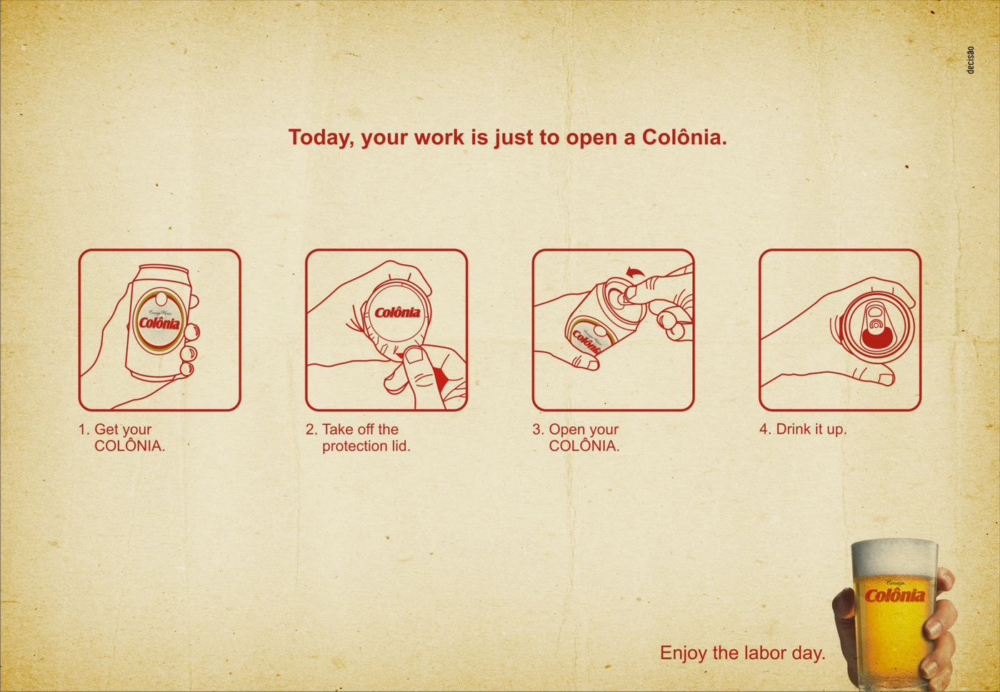 Decisao Comunicacao предлагает отметить День труда за банкой пиваАгентство Decisao Comunicacao, довольно необычными плакатами для Colonia Beer, призывает общественность отметить День труда. Как утверждают криэйторы, единственной работой, которую вам придется выполнить в этот день – это открыть баночку Colonia. Агентство: Decisao Comunicacao, Florianopolis, Brazil Креативный директор: Alexandre Guedes Иллюстратор: Marcus Vinicius Копирайтер: Alexandre Hinterholz |