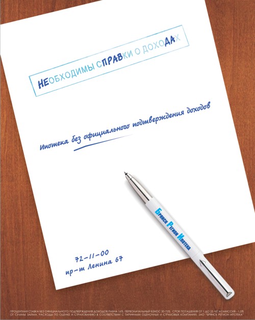 С помощью рекламы брянский банк попробовал разубедить клиентов в необходимости сбора справокC 1 мая 2008 года в печатных СМИ г.Брянска стартовала рекламная поддержка специального предложения ЗАО "Брянск Регион Ипотека". Основное коммуникационное послание - ипотека без официального подтверждения доходов, т.е. больше не нужно никаких справок о доходах, штампов и печатей с места работы и т.п.По словам автора, данный принт содержит ряд идей, объединенных общей концепцией "Хватит штампов". Состав творческой группы Клиент: ЗАО "Брянск Регион Ипотека" Агентство: MA "Promo Marketing" Копирайтер: Сычёв Евгений Арт-директоры: Конищева Евгения, Сычёв Евгений Название: Хватит штампов
