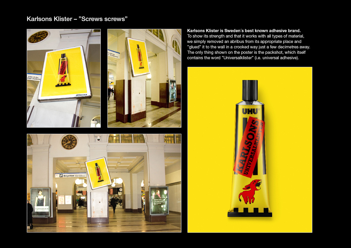 Karlsons Klister - приклеит намертвоKarlsons Klister - один из самых популярных в Швеции брендов клея. Для того, чтобы еще раз доказать очевидное, а именно, эффективность клея при склеивании любых поверхностей, агентство Volt неровно "приклеило" рекламный плакат с изображением пэкшота и одной единственной надписью: "универсальный клей".Агентство: Volt, Stockholm, Sweden Креативный директор: Mans Jacobsson Hosk Арт директор: Alexander Hansen Копирайтеры: Jens Thelfer, Joakim Hutchinson-Kay Фотограф: Vostro |