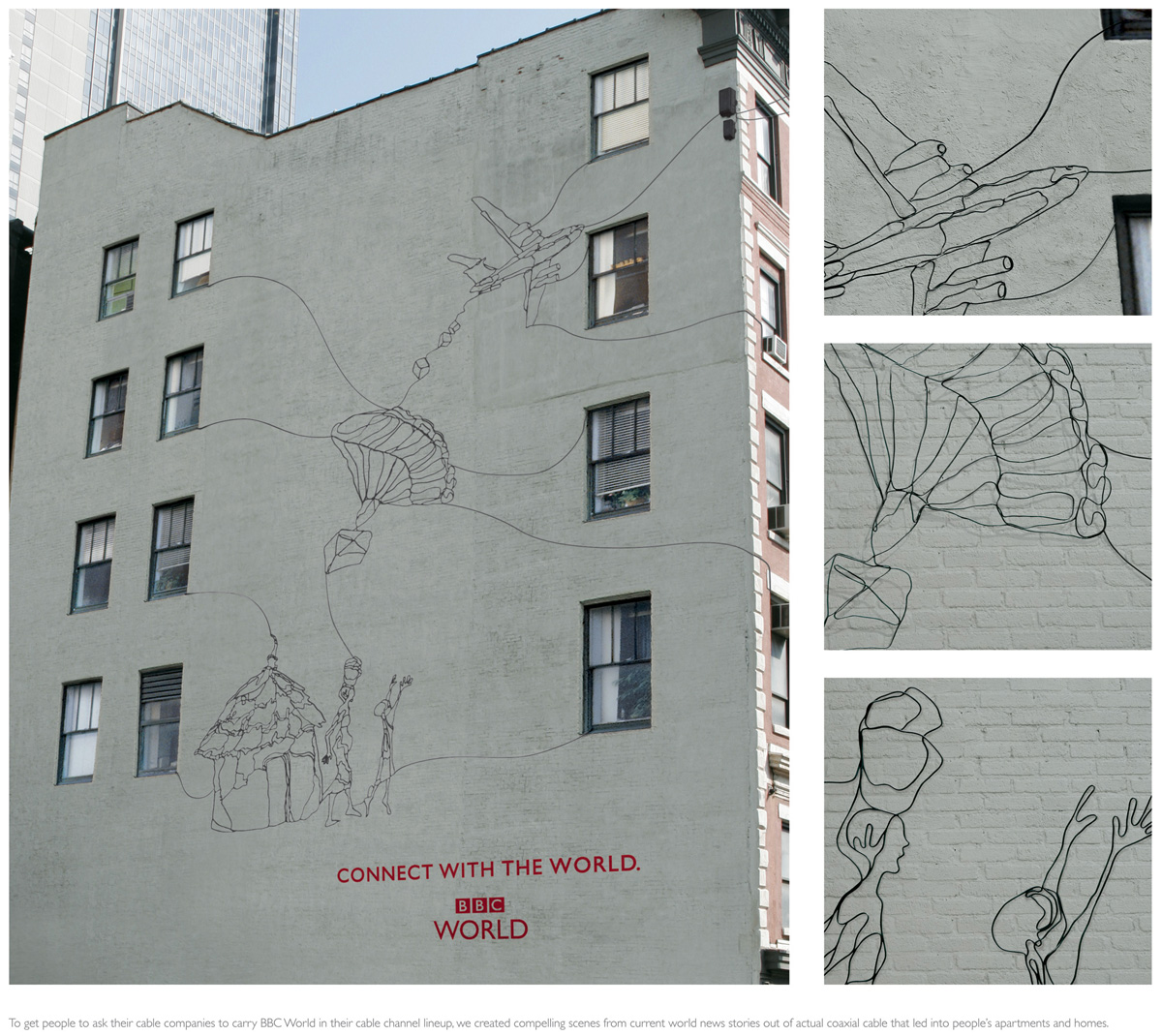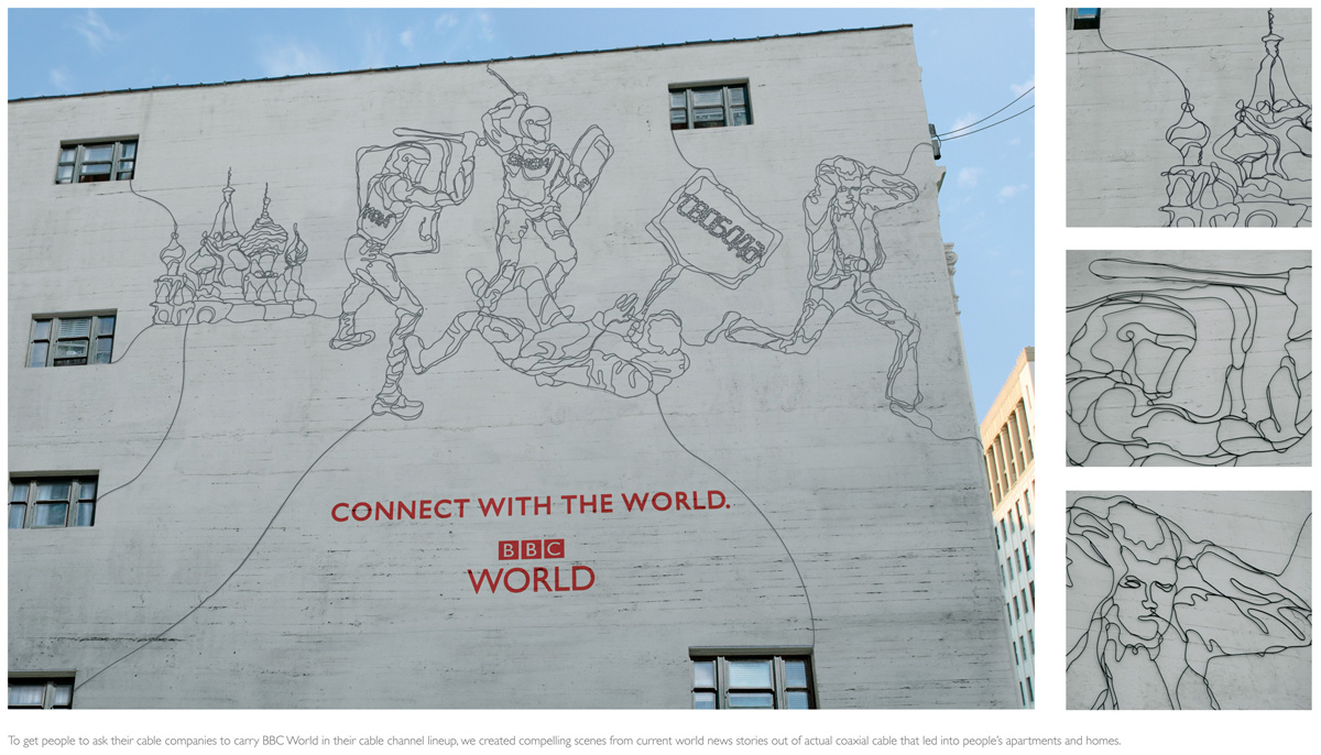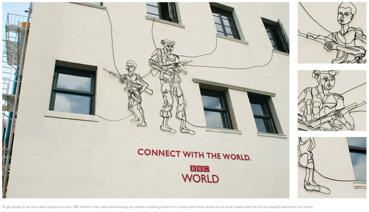Связь по проводамТак теперь всё и будет. Рекламные агентства начали понимать, что интересные вещи можно творить не только в специально отведённых для этого пространствах и специально предназначенными для этого веществами. Ассимиляция искусства рекламой дошла до граффити и уличного искусства аж в 60-х. Но, стоит честно признаться, на такие высоты манипулирования дополнительными значениями городской среды она забралась не столь давно. Рекламная кампания BBC World от агентства BBDO New York, собранная из проводов:Рекламное агентство: BBDO New York, США Исполнительный креативный директор: Эрик Сильвер (Eric Silver) Креативные директоры: Жером Маруччи (Jerome Marucci), Стив МакЭлиотт (Steve McElligott) Арт-директор: Чак Тсо (Chuck Tso) Иллюстратор: Элизабет Берриен (Elizabeth Berrien) Копирайтер: Скотт Каплан (Scott Kaplan) KAK.RU |