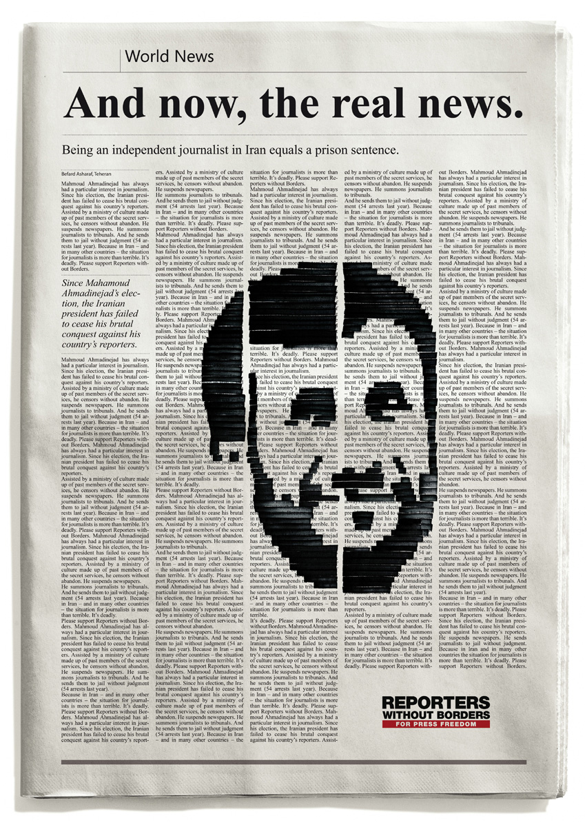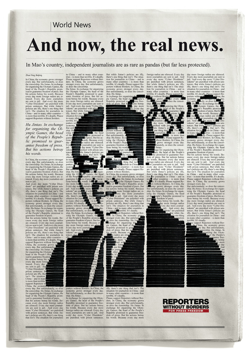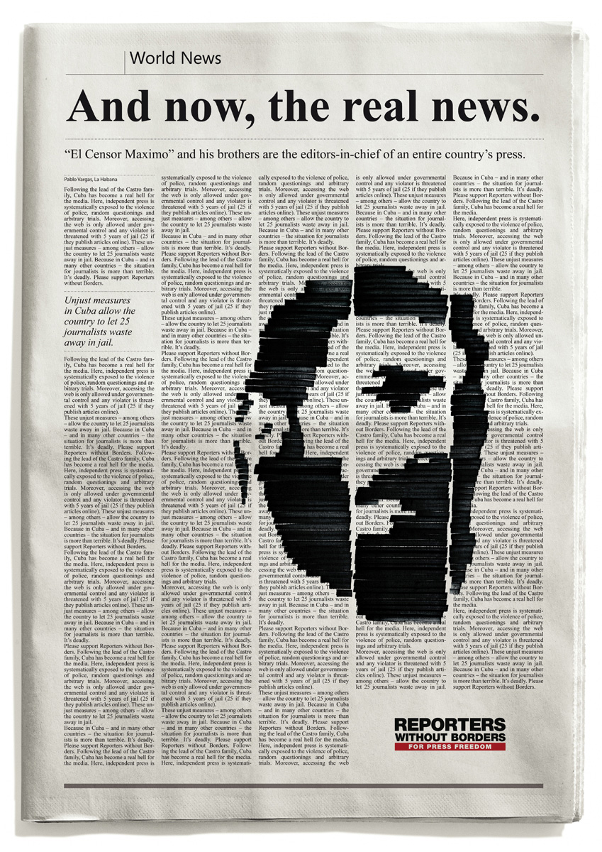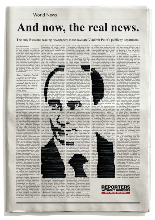 Владимир Путин против свободных СМИ: общественная организация Reporters Without Borders включила бывшего президента России в свой «черный» списокИз материалов, недавно опубликованных на Sostav.ru, можно сделать вывод о том, что свобода средств массовой информации в России находится под большим вопросом. Очередной камень в огород Кремля бросила организация Reporters Without Borders («Репортеры Без Границ»), выпустив принты под общим лозунгом «А теперь, настоящие новости». Среди таких «героев» свободных СМИ как китайский президент Ху Цзиньтао, иранский руководитель Ахмадинижад и кубинский вождь Фидель Кастро, нашлось место и бывшему президенту Российской Федерации Владимиру Путину.Состав творческой группы: Advertising Agency: McCann Erickson, Geneva, Switzerland Creative Director: Timo Kirez Art Director / Illustrator: Angelo Sciullo Copywriters: David von Ritter, Chantal Panozzo Published: March 2008 |