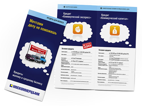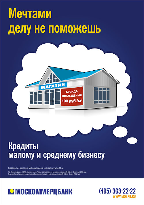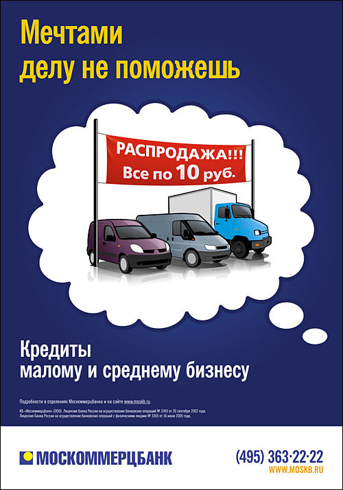 Москоммерцбанк не поможет делу мечтами"Мечтами делу не поможешь" - так называется кампания по запуску новой линейки коммерческих кредитов для малого и среднего бизнеса, которая была разработана творческой группой NC Design совместно с Москоммерцбанком.Основная идея концепции состоит в том, что есть возможность сделать бизнес прибыльным без мечтаний о несбыточном благополучии. Идея получила развитие в постерах и буклете, где появилось противопоставление неосуществимой мечты и реального шанса развития бизнеса за счет кредитов банка. Согласно концепции, финансового чуда не произойдет, если не предпринимать определенных шагов. Так, например, неплохо мечтать о том, что стоимость аренды магазина вдруг станет неправдоподобно низкой, но в реальности такого быть не может. Выход из этой ситуации прост - взять кредит и с помощью него реализовать свои планы. Мечты о том, что стоимость автомобиля упадет до 10 рублей, - несбыточны, однако есть реальная возможность получить автомобиль при помощи кредита на коммерческий транспорт. "Стремительно развивающийся рынок малого и среднего бизнеса требует постоянного движения вперед, не оставляя времени для пустых фантазий. Эта мысль стала определяющей при формировании визуального ряда нашей кампании", - говорит Владимир Морозов, директор Департамента коммуникационного маркетинга Москоммерцбанка. Состав творческой группы Команда Москоммерцбанка: Владимир Морозов - куратор проекта Яна Двухжилова - менеджер проекта Разработка идеи и визуализация - студия NC Design Алексей Бойко - арт-директор Александра Роскина - иллюстратор Екатерина Шмаленюк - копирайтер Мария Путова - эккаунт-директор