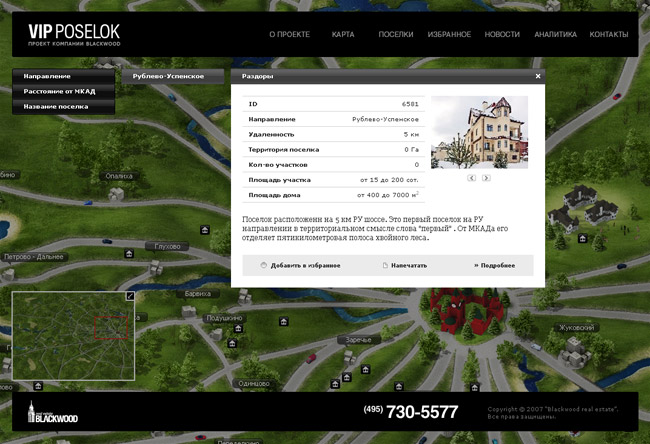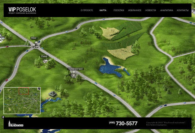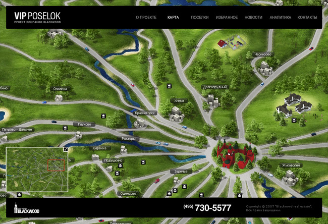 Nile Studio разработали сайт для нового проекта Компании Blackwood, посвященному 100 лучшим поселкам ПодмосковьяКомпания Blackwood выступила с проектом www.vip-poselok.ru, посвященным элитной дачной недвижимости.Главным визуальным элементом, и, в то же время, фоном, на котором размещается вся информация на сайте, стала стилизованная карта Подмосковья. Nile Studio www.nile.ru отошли от традиционной картографической условности. Привычная карта превращается на сайте в изящную, словно игрушечную, трехмерную миниатюру. Москву на карте представляет стилизованный Кремль, от него расходятся в разные стороны шоссе, по которым едут маленькие машинки. В такой же, трехмерной игрушечной стилистике, на сайте-карте отмечены реки, озера, леса и, конечно, сами поселки. Также показана и разветвленная инфраструктура - на карте можно найти конноспортивные клубы с крошеными лошадками и наездниками, яхт-клубы, гольф-клубы и многое другое. У пользователя есть возможность, перемещаясь по карте, которая раскинулась далеко за пределы экрана, познакомиться с загородными поселками, которые представляет компания Blackwood. Чтобы получить подробную информацию нужно просто кликнуть на интересующее вас место на карте. В основе сайта - технология AJAX. Подача информации напоминает скорее интерфейс программного приложения или компьютерной игры, чем привычное для веб-сайтов оформление контента. Состав творческой группы Юра Алексеев - арт-директор Данил Криворучко - арт-директор, дизайнер Михаил Питерцев - дизайнер Александр Гладких - дизайнер Леха Черкасов - 3D моделлер Владимир Жидков - технический руководитель Евгений Поздняков - программист Елена Охапкина - руководитель проекта |