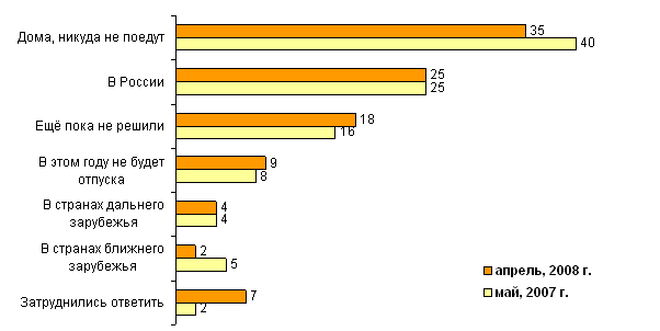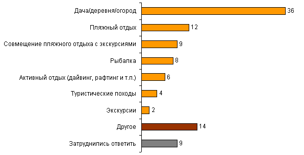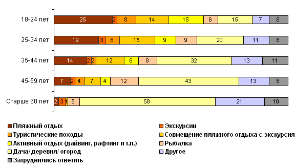 Каждый третий россиянин собирается провести отпуск домаВ апреле текущего года в рамках всероссийского опроса исследовательский холдинг Ромир задал респондентам традиционные вопросы об их планах на отпуск и предпочитаемых видах отдыха. В исследовании приняли участие 1653 человека в возрасте от 18 лет и старше. Статистическая погрешность не превышает ±2,5%. Ответы на вопрос: «Где Вы планируете провести свой очередной отпуск?», распределились следующим образом: ![]() 35% респондентов ответили, что не планируют никуда уезжать и проведут свой очередной отпуск дома. Чаще всего так говорили люди с низким уровнем дохода (46%) и жители сельской местности (45%). Четверть опрошенных (25%) собираются отдохнуть в России. Значимо чаще, чем в среднем по выборке такой вариант ответа давали жители городов-миллионников (32%), крупных городов с населением от 500 тыс. до 1 млн. человек (34%), а также респонденты, у которых есть дети младше 16 лет (31%). В страны дальнего зарубежья отправятся 4% опрошенных, причем чаще всего так отвечали жители Центрального (6%) и Северо-Западного (8%) регионов России, респонденты в возрасте от 25 до 34 лет (8%), участники опроса, проживающие в городах с населением более 1 млн. человек (11%) и высокодоходные категории граждан (11%). Примечательно, что участники опроса, проживающие в Сибири, практически не рассматривают возможность провести отпуск за рубежом. В страны ближнего зарубежья поедут лишь 2% россиян, 18 % пока ещё не определились с выбором места отдыха, а у 9% вообще не будет отпуска в этом году. При ответе на вопрос: «Какому виду отдыха Вы отдаете предпочтение?», ответы респондентов распределились следующим образом: ![]() Самым популярным видом отдыха среди россиян традиционно остается дачный отдых. Более трети опрошенных (36%) предпочитают отдыхать на даче (в деревне, на огороде), значимо чаще так отвечали респонденты в возрасте от 45 до 59 лет (43%) и старше 60 лет (58%). Предпочитаемые виды отдыха россиян Распределение по возрасту ![]() Неохотно россияне тратят свой отдых на экскурсии (2%), чаще выбирают пляжный отдых (12%). Приверженцами пляжного отдыха являются в основном молодые люди в возрасте от 18 до 24 лет (25%), а также респонденты от 25 до 34 лет (19%). Наиболее любознательные отдыхающие совмещают пляжный отдых с экскурсиями (9%). Как показали результаты исследования, для 17% российских мужчин, из числа опрошенных, лучший отдых – это рыбалка. А активные виды отдыха (дайвинг, рафтинг и т.п.), в целом по выборке набравшие лишь 6% голосов, наиболее популярны среди молодежи от 18 до 24 лет (15%). В туристические походы готовы отправиться лишь 4% респондентов. www.rmh.ru |