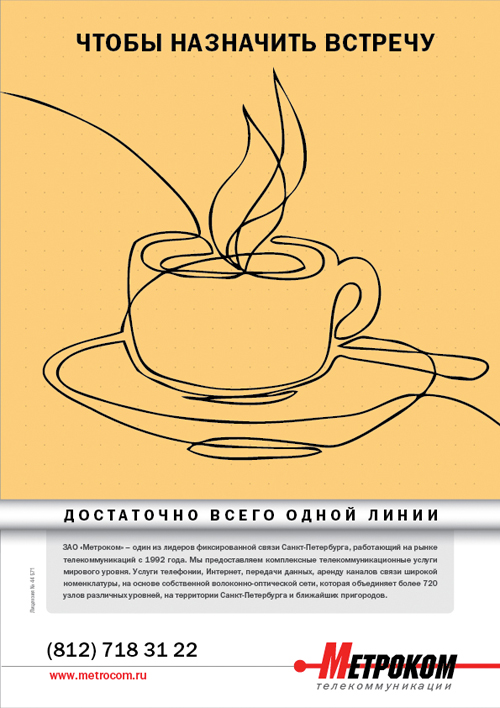 Znamenka провела длинную извилистую линию для компании «Метроком»Компания «Метроком» обновила рекламную концепцию. Идея новой рекламной кампании основана на позиционировании ЗАО «Метроком» как телекоммуникационного оператора, предоставляющего все возможности для эффективного взаимодействия в различных ситуациях, как в ведении бизнеса, так и в повседневной жизни. Концепция новой имиджевой рекламной кампания под слоганом «Достаточно всего одной линии» разработана Агентством маркетинговых коммуникаций Znamenka.Креативное решение - единая линия, содержащая в себе все возможности современных телекоммуникаций, которая соединяет/ объединяет/ связывает и в прямом и в переносном смысле. Компания проходит в деловой прессе и наружных носителях. На данный момент визуализацию идеи можно увидеть на сайте компании «Метроком», а также на речном транспорте.