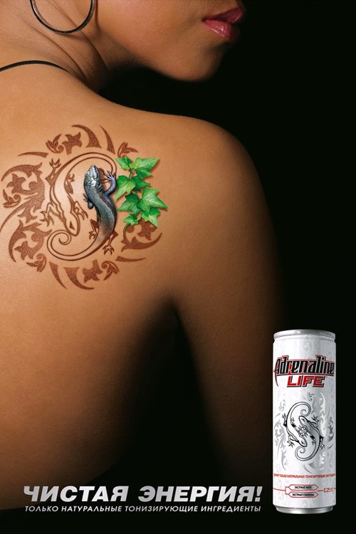 Используя знак напитка Adrenaline Life - двух ящериц (символ энергии) как татуировку на теле девушки, креативная команда брендингового агентства BoxSide brand & package предложила "оживить" их, показав, что Adrenaline Life - источник абсолютно чистой жизненной энергии, способный оживить не только тебя, но даже татуировки на твоем теле. Маркетинговая концепция Adrenaline Life основывается на постоянно растущем потребительском тренде предпочтений натуральным и чистым продуктам питания и моде на здоровый образ жизни. Ядром потребительской аудитории выбраны активные, стильные, современные молодые люди, стремящиеся к приключениям и открытые для всего нового. В настоящее время на телевидении проводится рекламная кампания нового бренда, лицом которого стала девушка, напоминающая неотразимую Лару Крофт, расхитительницу гробниц с повадками пантеры. Состав творческой группы: Руководитель проекта и креативный директор - Алексей Муразанов; Арт директор - Жанна Резаева; Дизайнер - Антонина Тарева; Художник - Руслан Богачев; Фотохудожники - Владимир Морозов, Владимир Морозов мл.; Стилист - Наталья Голубь; Аккаунт директор - Ольга Аникина. ![]() |