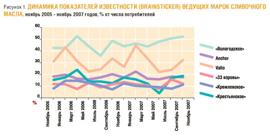 Постоянным лидером рейтинга известности является торговая марка «Вологодское» (разных производителей). Используемый нами показатель известности – BrainSticker – среди всех покупателей сливочного масла составляет для торговой марки «Вологодское» почти 50%. Причем эта торговая марка является безусловным лидером известности на протяжении всего периода исследования, на протяжении которого ее BrainSticker не опускался ниже 37% (рис. 1).