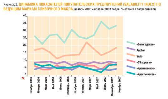 Показатель Salability Index, отражающий количество покупателей, выбирающих продукт под данной торговой маркой, для «Вологодского» масла тоже очень высок. В настоящее время он приближается к 34%, а за все время наблюдений ни разу не опускался ниже 20% (рис. 2). Значение этого показателя для марки Valio составляет 18%, а остальные марки не смогли преодолеть и 10%-ного рубежа.