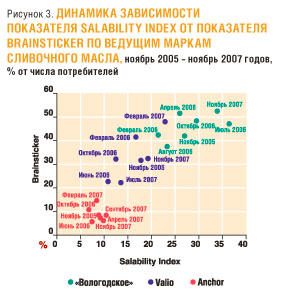 Эффективность потенциала бренда «Вологодское» в сознании потребителей хорошо иллюстрируется сравнением показателей известности (BrainSticker) и потребления (Salability Index). Сравнение динамики этих показателей наглядно иллюстрирует, что марка Valio уже наступает на пятки лидеру, хотя торговая марка «Вологодское» пока сохраняет первую позицию (рис. 3).