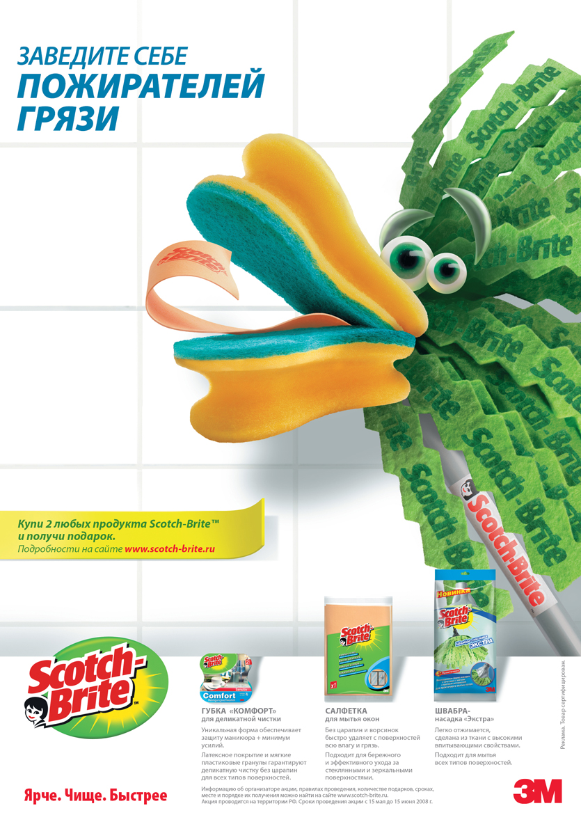 Art-Com WP устроил день пожирателей грязиПод таким призывом стартовала рекламная кампания по продвижению чистящих продуктов торговой марки Scotch-Brite компании "3M Россия".В основу рекламной кампании легла промо-акция, стартовавшая с 15 мая в 6-ти городах России. Стратегия продвижения, креативная концепция, а так же ее медиа-поддержка в прессе и на радио обеспечена Рекламным Домом ART-COM WP. В рамках стратегической работы также был разработан бренд-слоган "Scotch-Brite. Ярче. Чище. Быстрее". Состав творческой группы: Директор творческого департамента - Марон Казак Руководитель стратегического департамента - Екатерина Сычева Стратег - Марина Гусайнова Креативный директор проекта - Дмитрий Зарва Копирайтер - Николай Волков Фотограф - Алексей Беляев |