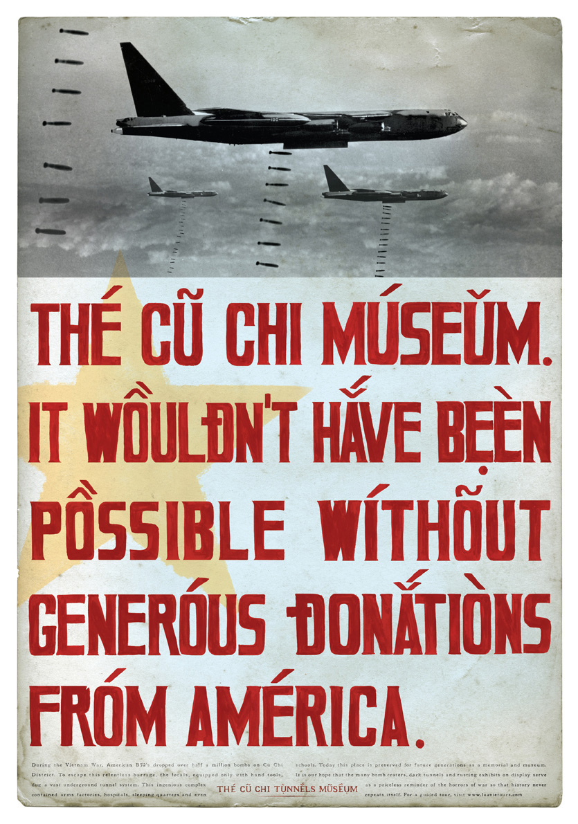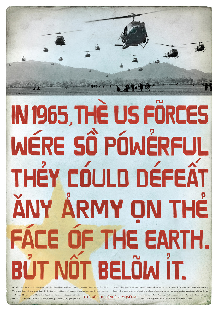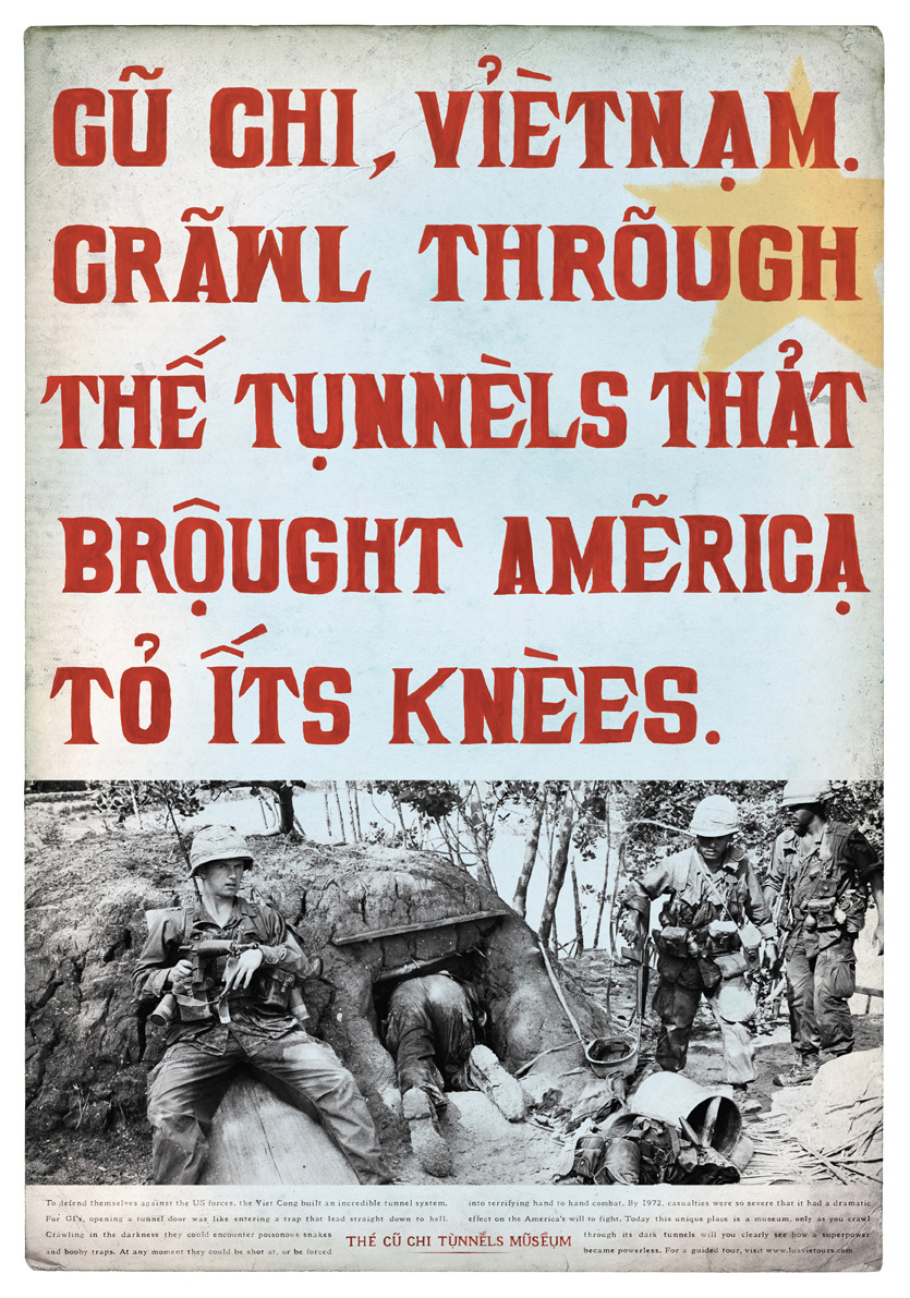 Склонись, Америка!Граждане Вьетнама, несомненно, гордятся своей трудной победой над американскими войсками. Немудрено, кинематограф США уже несколько лет пытается осмыслить, что же там на самом деле случилось. Но гордость эта — с горькой усмешкой. Вот, к примеру, такие принты создали во вьетнамском Saatchi & Saatchi для рекламы военного музея.В 1965-м американская армия была столь сильна, что могла уничтожить любую страну на земле. Но не ту, что под землёй. Музей Ку Чи. Наше дело было бы невозможно без великодушных американских дотаций. Ку Чи, Вьетнам. Тоннели, которые поставили Америку на колени. Ирония в том, что надписи на них — на-английском. Рекламное агентство: Saatchi & Saatchi Вьетнам Исполнительные креативные директоры: Steve Hough, Andy Greenaway Креативные директоры: Joel Clement, Sumesh Peringeth Арт-директоры: Joel Clement, Sumesh Peringeth, Linda Pham Копирайтеры: Steve Hough, Chi-Minh De Leo KAK.RU |