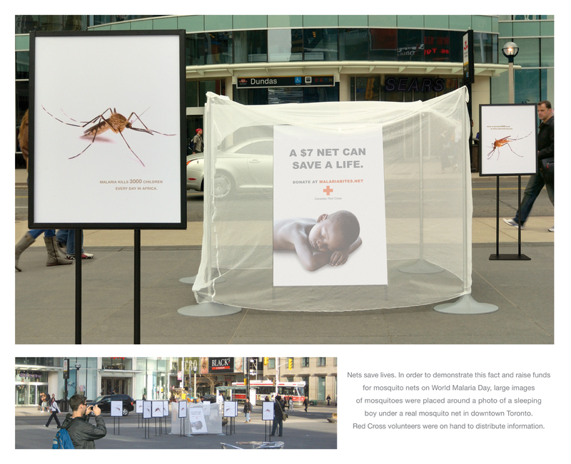 Малярийные комары атакуют ребенка на улицах ТоронтоКанадское отделение "Красного Креста" и рекламное агентство Juniper Park приурочили к Всемирному Дню Малярии необычную кампанию. В центре Торонто была создана инсталляция: изображение ребенка под москитной сеткой и несколько комаров вокруг. Это должно было показать прохожим, что москитная сетка - это очень действенный способ борьбы с малярией, от которой в Африке ежегодно погибает около 3 000 детей. Цель кампании - увеличить пожертвования в фонд, направленный на закупку москитных сеток для африканцев.Агентство: Juniper Park Творческий директор: Terry Drummond/Alan Madill Арт директор: Hylton Mann Копирайтер: Andy Linardatos Фотограф: Bela Tibor Kozma Продюсер: Debbie Ingham |