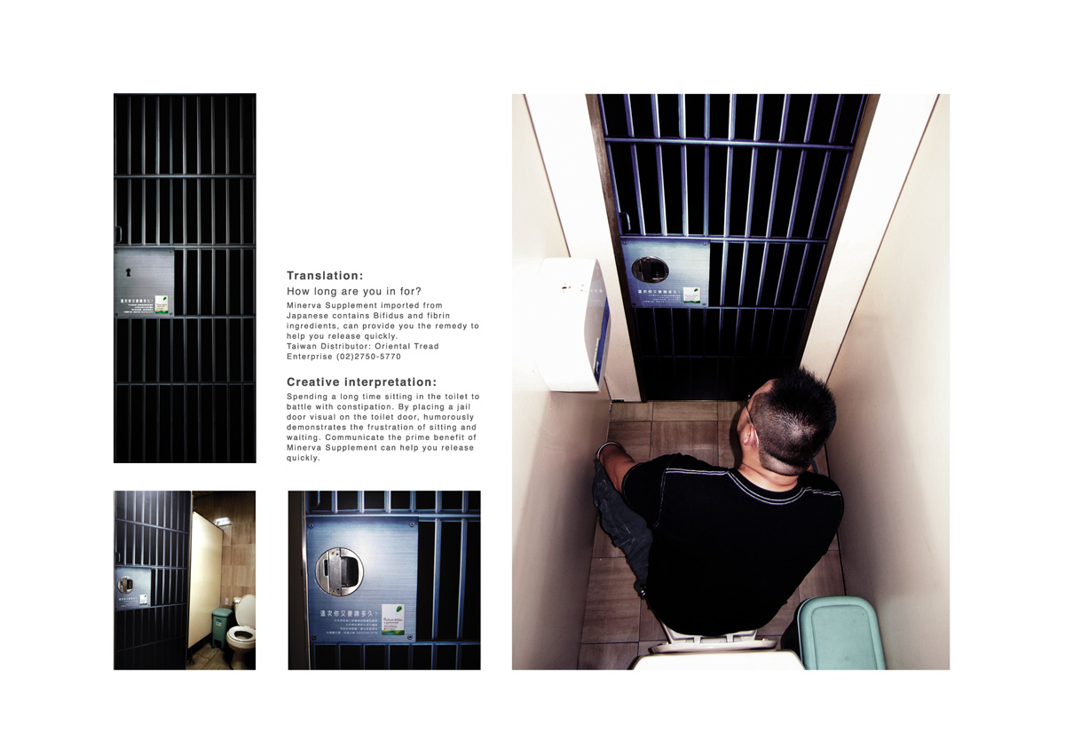 На дверях общественных туалетов рекламируют средство от запораMinerva Supplement - это японский лекарственный препарат, который содержит бифидобактерии и фибрин и способствует более быстрому облегчению. Чтобы прорекламировать это лекарство, тайваньское агентство DRAFTFCB сравнило длительное пребывание сидение на унитазе с заключением в тюрьме, наклеив на двери общественных туалетов специальный постер.Надпись: "Как долго вы находитесь здесь с этой целью?" Агентство: DRAFTFCB, Тайбэй, Тайвань Творческий директор: I-Fei Chang, Josephine Lin Арт директор: Eddie Chen Копирайтер: York Chiu, Ivy Lu |