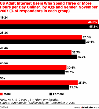 MediaRevolution.Ru уже не раз писала о том, что маркетологам не следует недооценивать степень компьютерной и интернет-грамотности представителей пожилой интернет-аудитории, которая нередко активно проводит время в Сети. По прогнозу аналитической компании eMarketer, число так называемых Silver surfers - пользователей Сети старше 62 лет, вырастет с 17,7 млн человек в 2006 году до 25,3 млн в 2011 году. A недавнее исследование, проведенное компанией Burst Media показало, что люди в возрасте старше 55 лет проводят в Сети больше времени в день, чем те, чей возраст составляет от 45 до 54 лет, и примерно столько же, сколько находятся онлайнзависают» пользователи 35-44 лет.