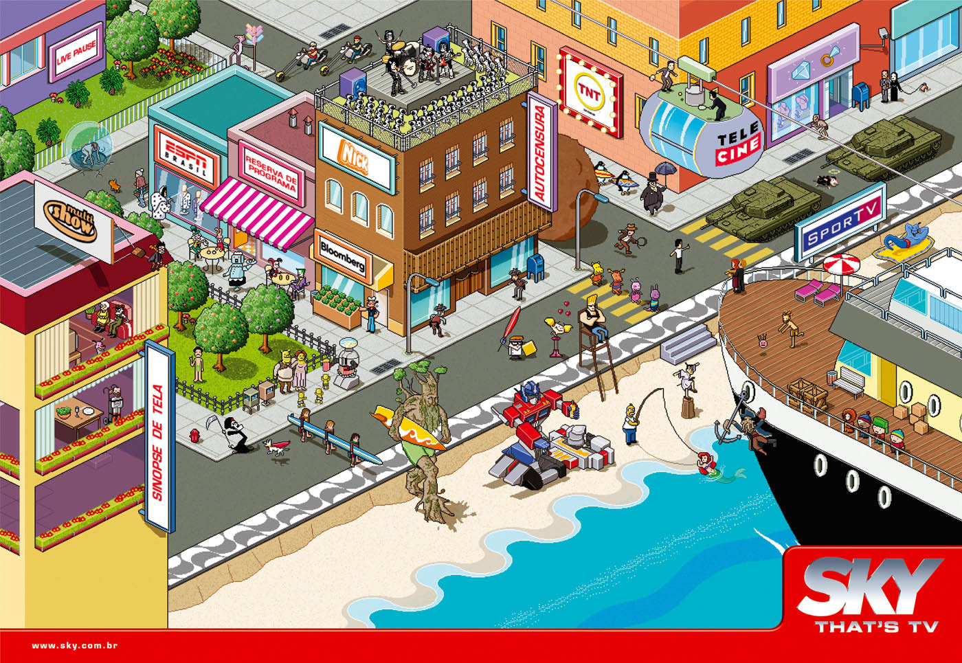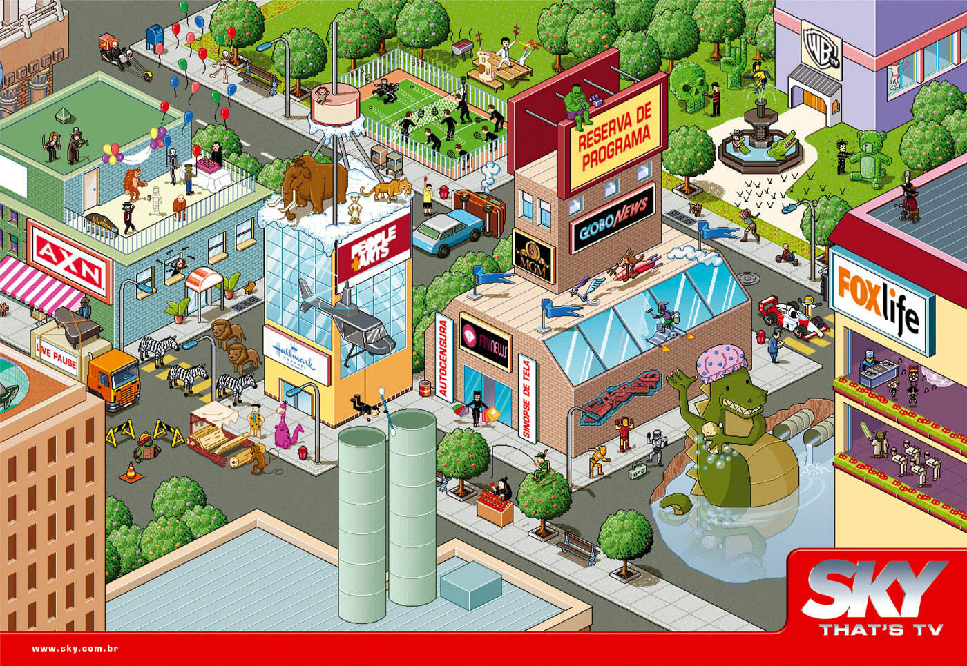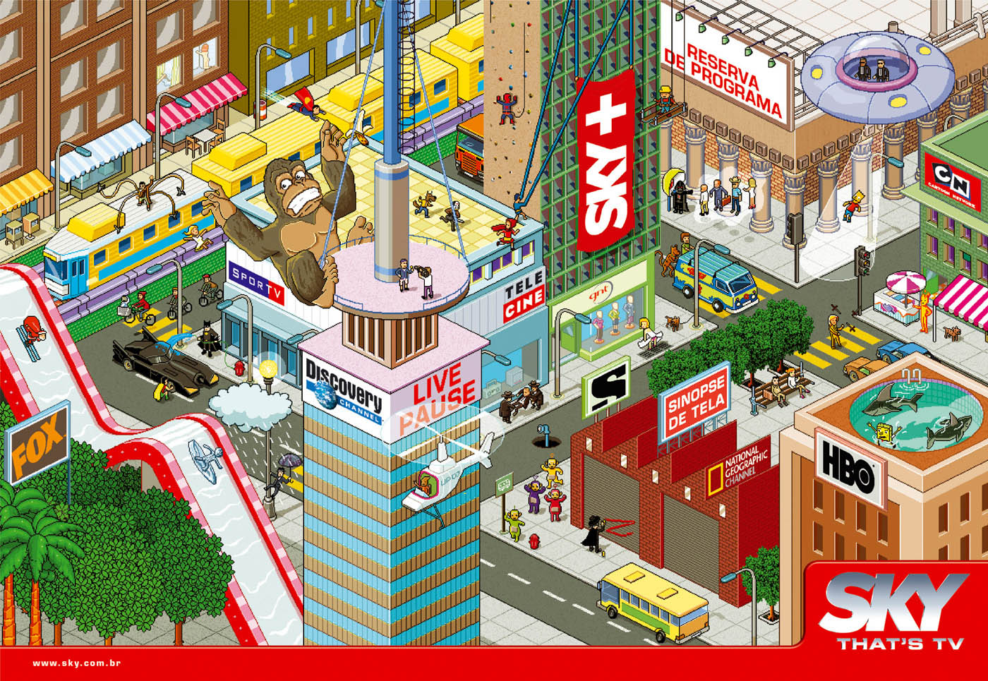 Победила дружбаВот доказательство того, что постмодерн из культуры никуда не делся, а лишь прячется, изредка показывая язык. Рекламные принты от бразильского агентства Giovanni + DraftFcb, созданные для телеканала Sky. Да, пиксельный арт уже много раз использовался, и да, этот ход, когда все герои в гости будут к нам (Нео, играющий в теннис с агентами Смитами, Годзилла в душе) — порядком навяз в зубах.Но когда эти два приёма объединяются в комбинацию, получается даже забавно: www.giovannidraftfcb.com.br KAK.RU |