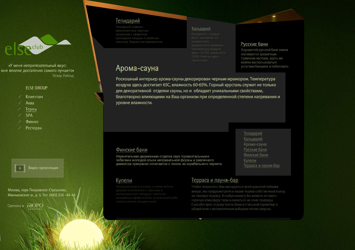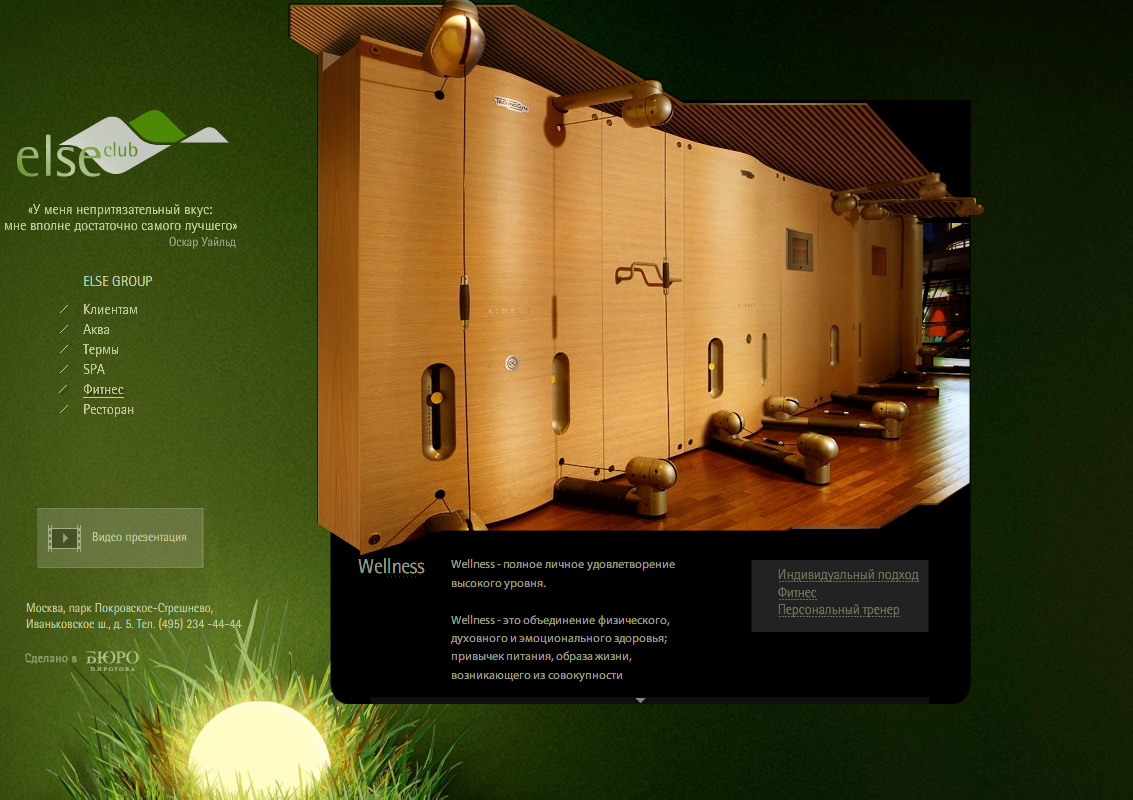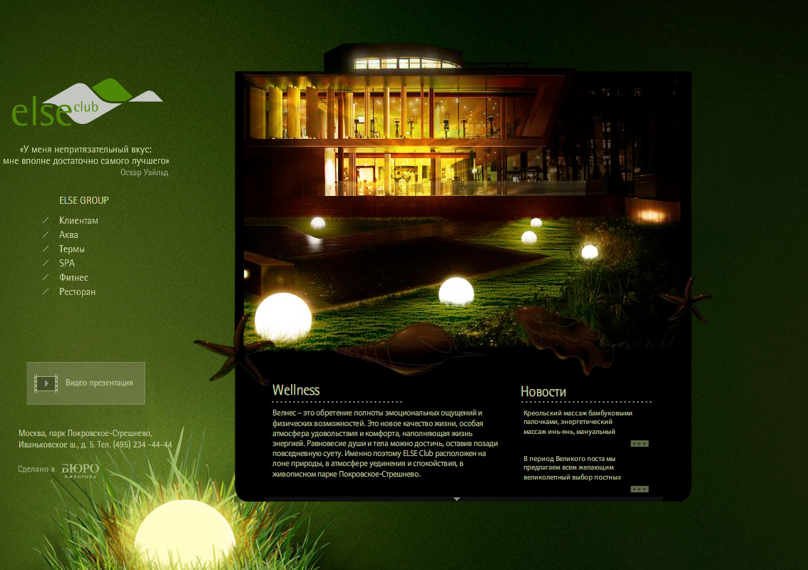 Для московского велнес-клуба премиум класса Бюро Пирогова выполнило редизайн сайтаПеред обновлением интернет-ресурса стояли задачи: новый сайт должен стать выразительнее, удобнее в пользовании, идентифицироваться с самим клубом и легко запоминаться.Для необходимого позиционирования клуба, в Бюро Пирогова было решено использовать фотографии интерьера и экстерьера, выигрышно украшенные возможностями флеш-анимации. Основное информационное поле сосредоточено в центральной части. Благодаря использованию нестандартной сетки, ориентироваться по сайту легко и просто. |