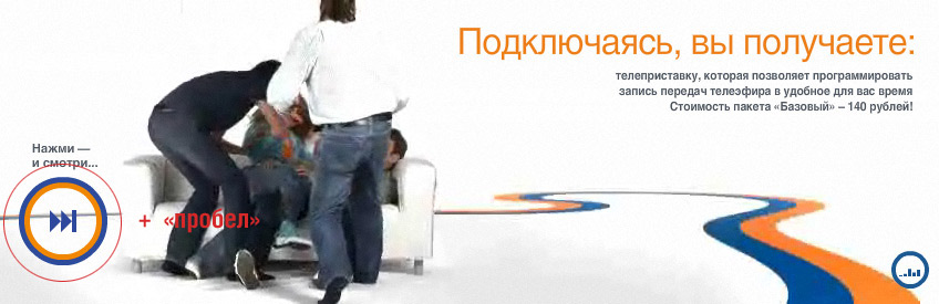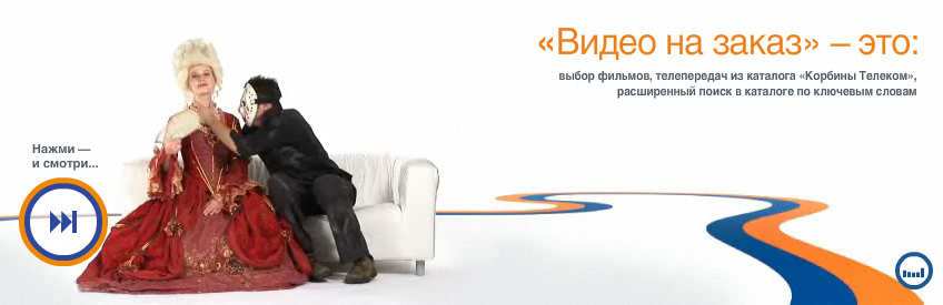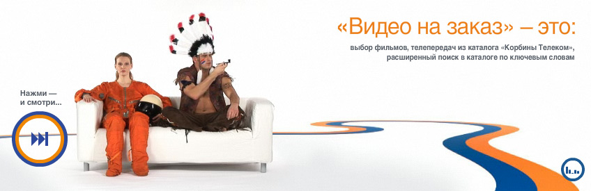 "Корбина Телеком" и Nile Studio устраивают костюмированные вирусные безобразия на диване перед телевизоромNile Studio продолжает работу по поддержке промо-активности компании "Корбина Телеком" в Интернете. На главной странице сайта home.corbina.ru размещен интерактивный видео-блок, рекламирующий услуги "Видео на заказ" и "Цифровое телевидение". Главными героями стали парень и девушка, сидящие на диванчике перед телевизором, по ту сторону которого находимся мы с вами.Блок управляется одной кнопкой, каждое нажатие которой приводит к преображению героев: из обычных среднестатистических молодых людей они перевоплощаются в различных киногероев. Девушка примеряет на себя личину инфернальной готессы, современницы Людовика ХIV, космонавта, а парня можно увидеть в образе супермена, маньяка и Чингачгука. В этом видео-блоке снялись профессиональные модели. Кстати, для любителей пикантных сцен Nile Studio приготовила сюрприз: если нажать одновременно на кнопку видео-блока и пробел, запустится бонусный ролик "Помешательство на съемочной площадке", в котором барышня начинает, нарушая все сценарные указания, приставать к своему партнеру. Молодой человек на заигрывания девицы, равно как и на ее попытки оседлать его реагирует весьма сдержанно. В итоге буянящую нимфоманку уводят из кадра не то санитары, не то члены съемочной группы. Как сообщили Sostav.ru в Nile Studio, прошлый вирусный ролик поднял посещаемость сайта "Корбина Телеком" до 50 тысяч уникальных посетителей в день. Ожидается, что очередная провокация принесет не менее впечатляющие плоды. |