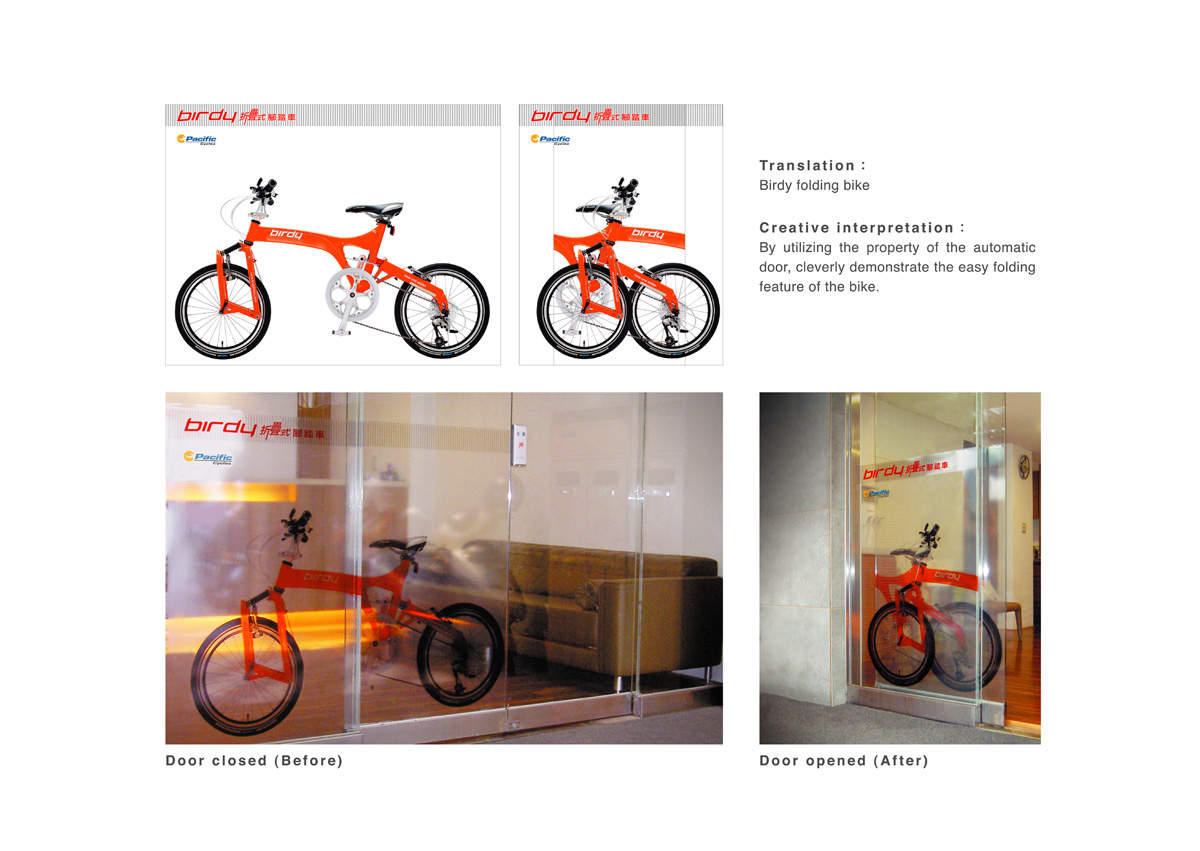 Для рекламы велосипедов Birdy использовали раздвижные двериЧтобы показать все преимущества складного велосипеда Birdy, тайваньское рекламное агентство DRAFTFCB решило представить этот велосипед в двух состояниях: разложенном и сложенном. Для этого были использованы прозрачные автоматические раздвижные двери, которые в процессе своей работы "складывали" и "раскладывали" велосипед Birdy.Агентство: DRAFTFCB, Тайбэй, Тайвань Творческий директор: I-Fei Chang, Josephine Lin Арт директор: Eddie Chen, Ahon Liao Копирайтер: Ivy Lu, York Chiu |