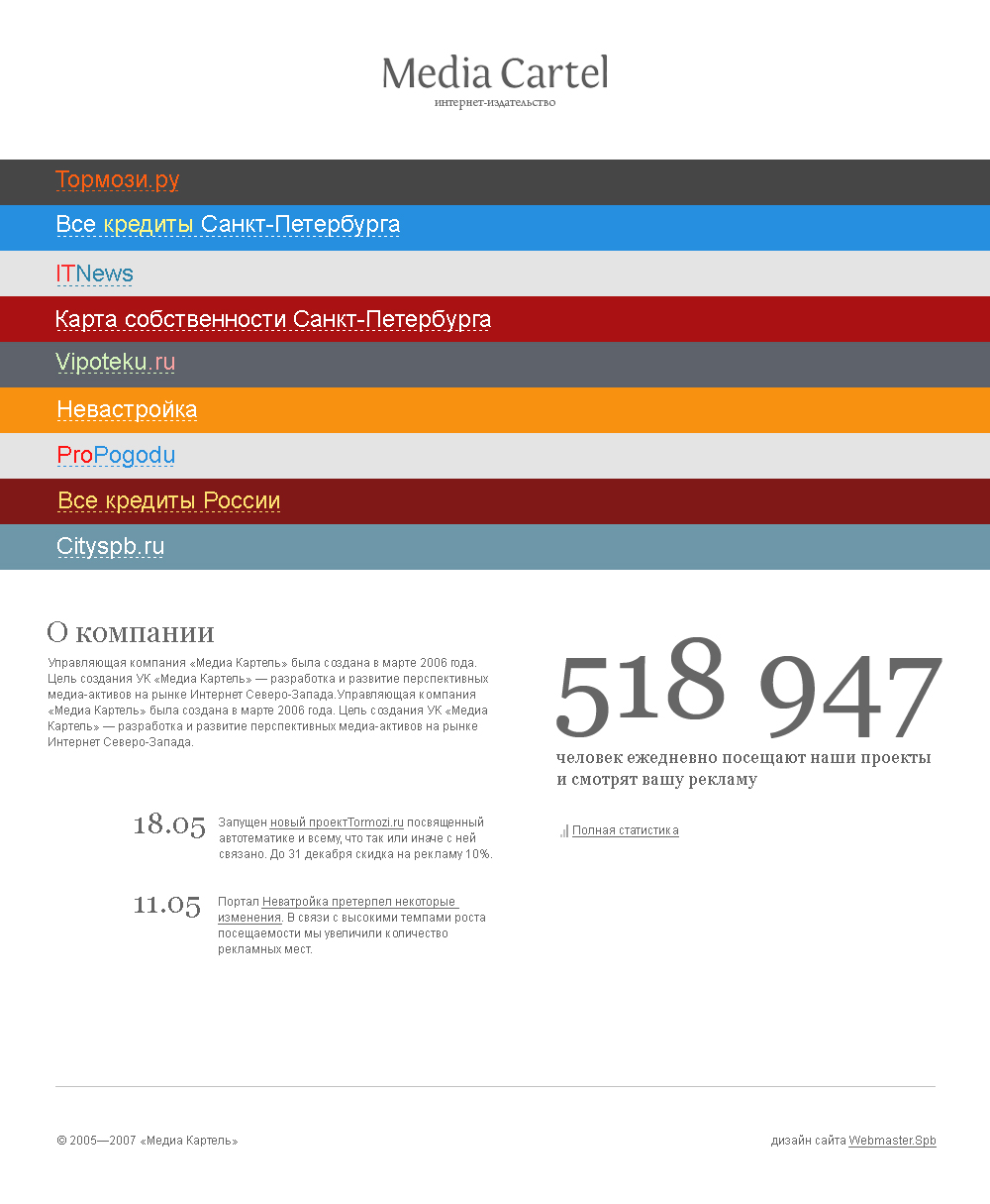 В рамках работ по созданию нового фирменного стиля "Медиа Картеля" компанией WebMaster.Spb был разработан новый сайт
