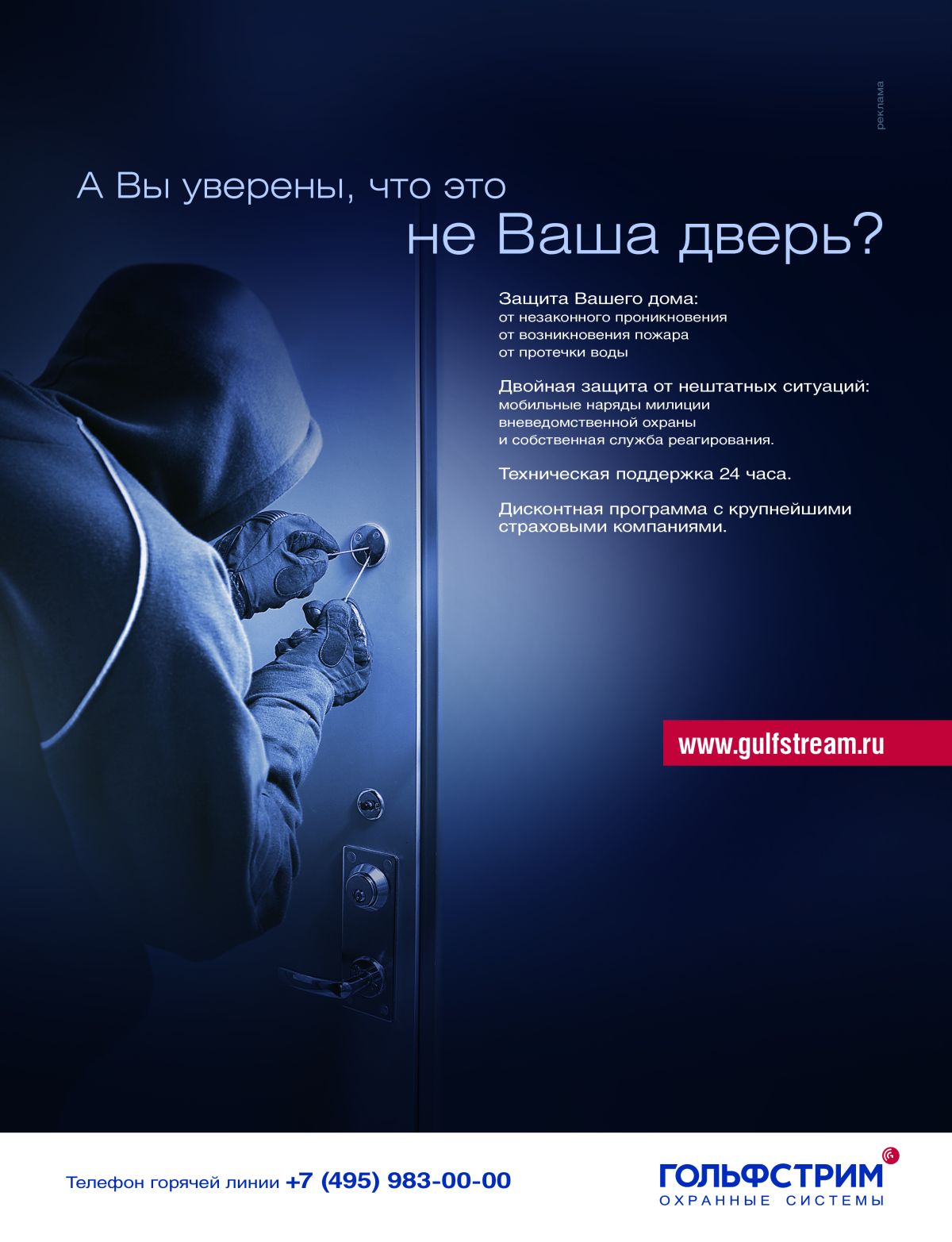 Коммуникационное агентство "Index" разработало рекламную кампанию для бренда "Гольфстрим"В мае этого года коммуникационное агентство "Index" по заказу Группы Компаний "Гольфстрим" разработало и воплотило в жизнь рекламную кампанию для бренда "Гольфстрим охранные системы".Концепция направлена против любимого "Авось!". Основная цель - добиться того, чтобы люди задумались над проблемой. Состав творческой группы Идея и реализация: Index Media Buying: Sorec-Media |