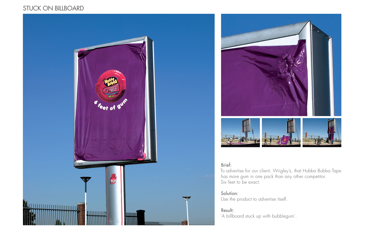 Реклама Hubba Bubba Tape держится на жвачкеЧтобы показать ЦА, что лента Hubba Bubba Tape от Wrigley's содержит в себе больше жвачки, чем любая другая упаковка, а именно 180 сантиметров (или 6 футов), африканское агентство DDB South Africa решило "приклеить" рекламный плакат на щит с помощью самого рекламируемого продукта.Агентство: DDB South Africa Творческий директор: Gareth Lessing Арт директор: Darren Borrino Копирайтер: Stuart Turner Фотограф: Clive Stewart Другое: Paul Binikos |